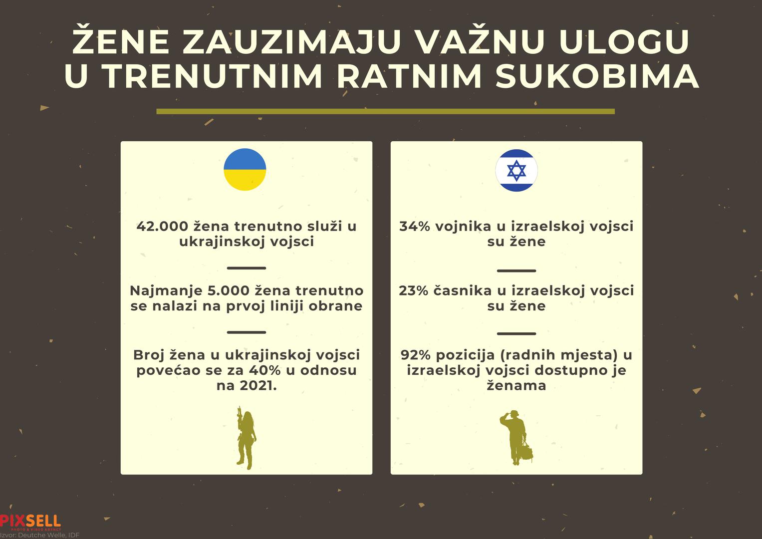U ukrajinskoj vojsci trenutno je 42.000 žena, a najmanje 5.000 žena nalazi se na prvoj liniji obrane. Broj žena u ukrajinskoj vojsci povećao se za 40 posto u odnosu na 2021. U izraelskoj vojsci je 34 posto žena, a 23 posto časnika su žene. Čak 92 posto radnih mjesta u izraelskoj vojsci dostupno je ženama.