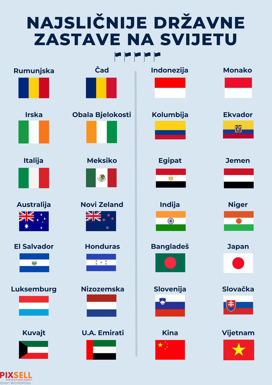 Izuzimajući nijanse, zastave Čada i Rumunjske gotovo da su identične, po obliku i bojama. Nalik jedna drugoj su i zastave Kneževine Monako i Republike Indonezije, rasporedom boja slijedi ih i Poljska. Slične zastave imaju i Slovenija i Slovačka, a ove dvije europske države međusobno zamjenjuju još od njihovog nastanka ranih devedesetih.