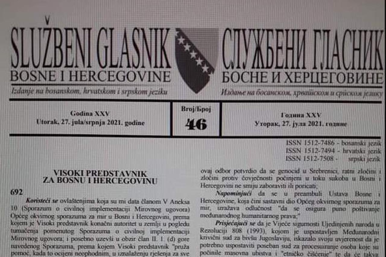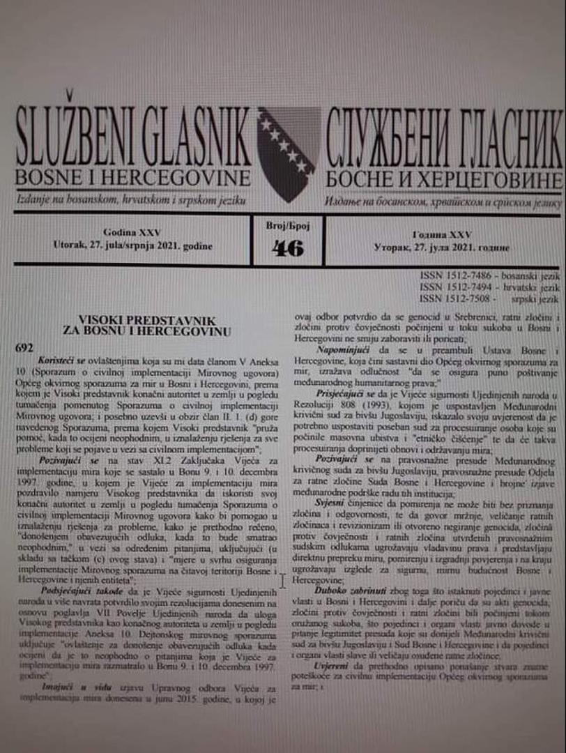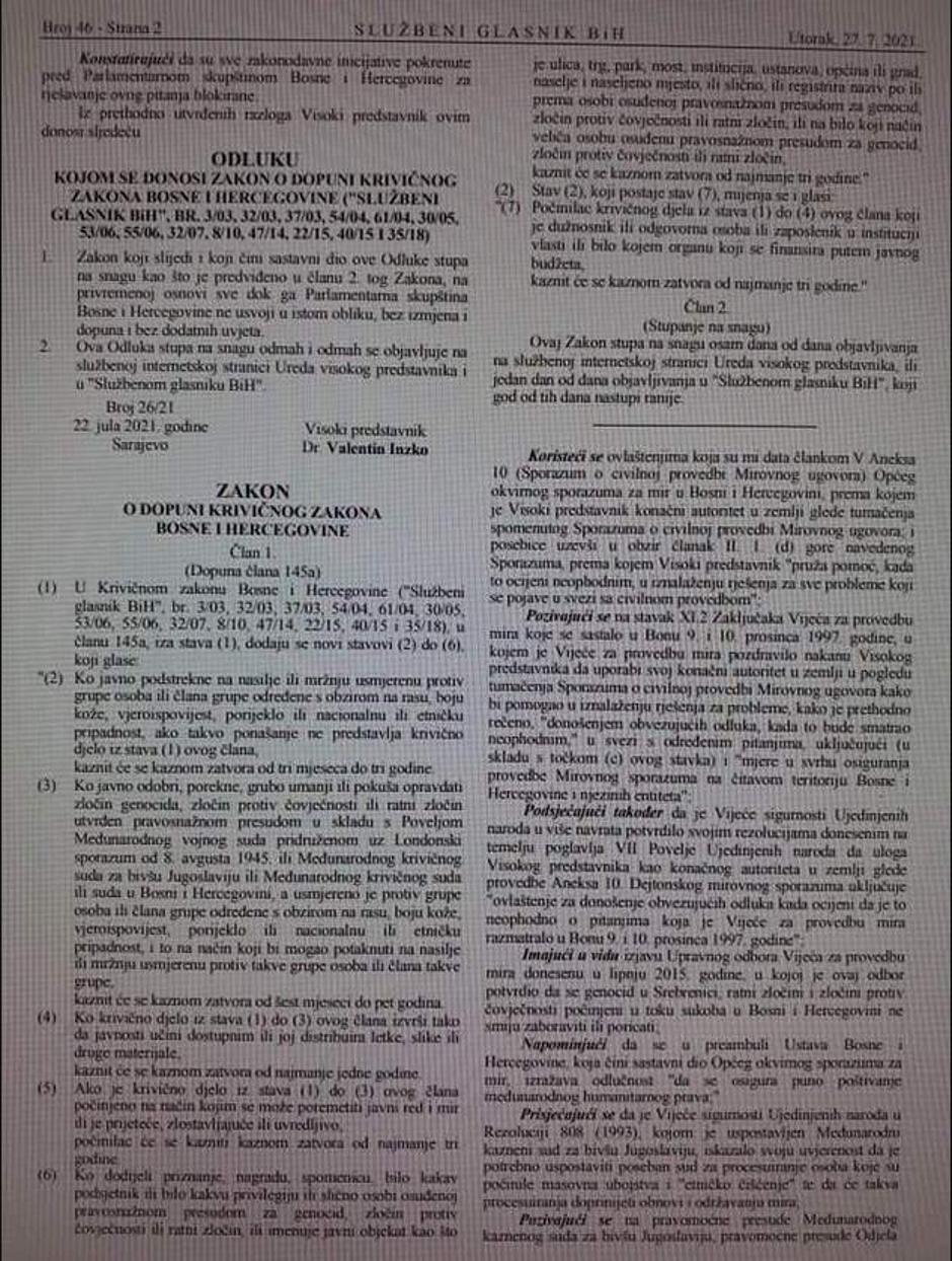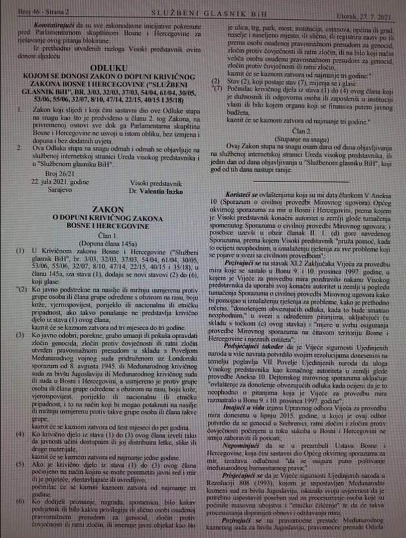 Odlazeći visoki predstavnik u BiH Valentin Inzko 23. srpnja je objavio da je iskoristio Bonske ovlasti i nametnuo dopune Krivičnog zakona Bosne i Hercegovine kojima se zabranjuje i kažnjava negiranje genocida.