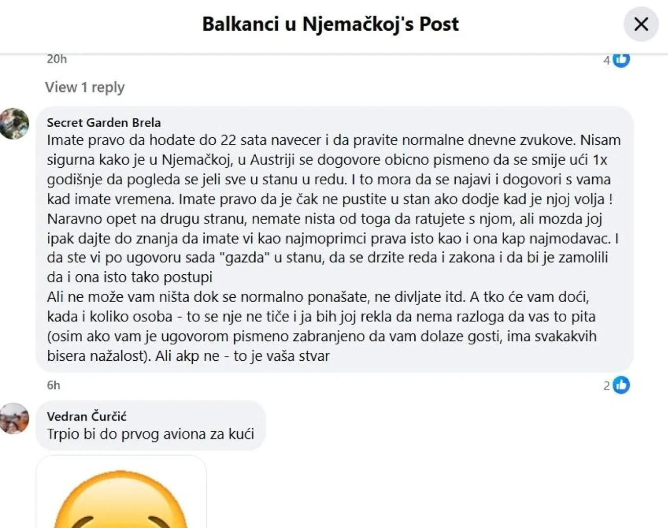 "Ne može ona tebe izbaciti, pročitaj u ugovoru što je napisano. Ne pravi puno buku između 22 i 6, ne ostavljaj cipele ispred vrata i nemaš se čega plašiti. Poznajem osobe koje imaju podstanare u kući i ne mogu ih izbaciti bez obzira što policija dolazi svako malo kad se potuče s momkom. Drugi slučaj neplaćanja stanarine, ide se na sud i taj stanar kaže: ‘Ja imam samo 50 eura.‘ Sutkinja kaže: ‘Eto, on ima volju, ali nema para i vi ga ne možete izbaciti na ulicu.‘ Njemačka je zemlja gdje je sve moguće. Ako već tražiš stan, onda nikada tamo gdje su ti vlasnici i gdje je Hausmeister u zgradi. To ti je baš narušavanje privatnosti", napisala je jedna žena.