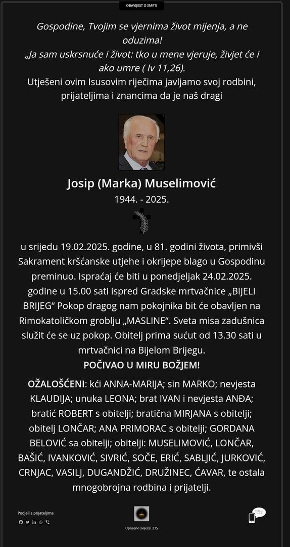 Ispraćaj će biti u ponedjeljak 24. veljače u 15 sati ispred Gradske mrtvačnice Bijeli Brijeg, a obitelj sućut prima od 13 sati.