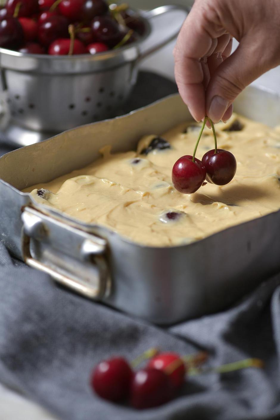 Polovicu opranih trešanja, kojima ste prethodno uklonili koštice (možete ih i ostaviti), uvaljajte prvo u brašno te ih onda ubacite u tijesto jer ćete tako spriječiti da trešnje potonu na dno.