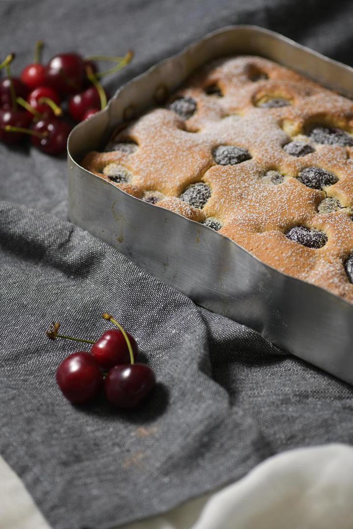 Za kolače poput ovog jednostavnog biskvita uvijek birajte sočnije i slađe trešnje, a bakin savjet je – ostavite koštice u trešnjama jer će tako kolač biti sočniji.