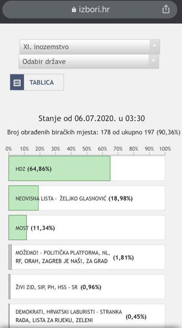 Do jutros u 03:30 sati obrađeno je ukupno 90,36 % glasova. Prema dosadašnjim rezultatima uvjerljivo vodi HDZ s 64,86 % glasova, dok je na drugom mjestu Neovisna lista - Željko Glasnović s 18,98 % glasova. Treći je Most s 11, 34 %, dok je platforma Možemo osvojila svega 1,81% glasova dijaspore.