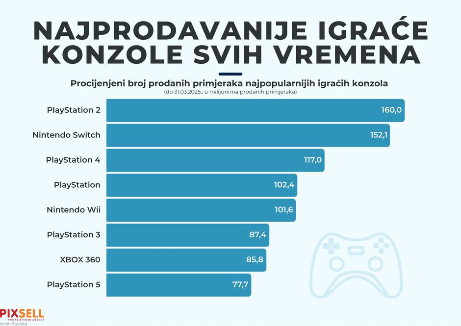 Prema procjenama broja prodanih primjeraka do 31. ožujka 2025., PlayStation 2 ostaje najprodavanija igraća konzola svih vremena s impresivnih 160 milijuna prodanih jedinica. Slijedi je Nintendo Switch s 152,1 milijunom, dok PlayStation 4 zauzima treće mjesto sa 117 milijuna prodanih primjeraka.