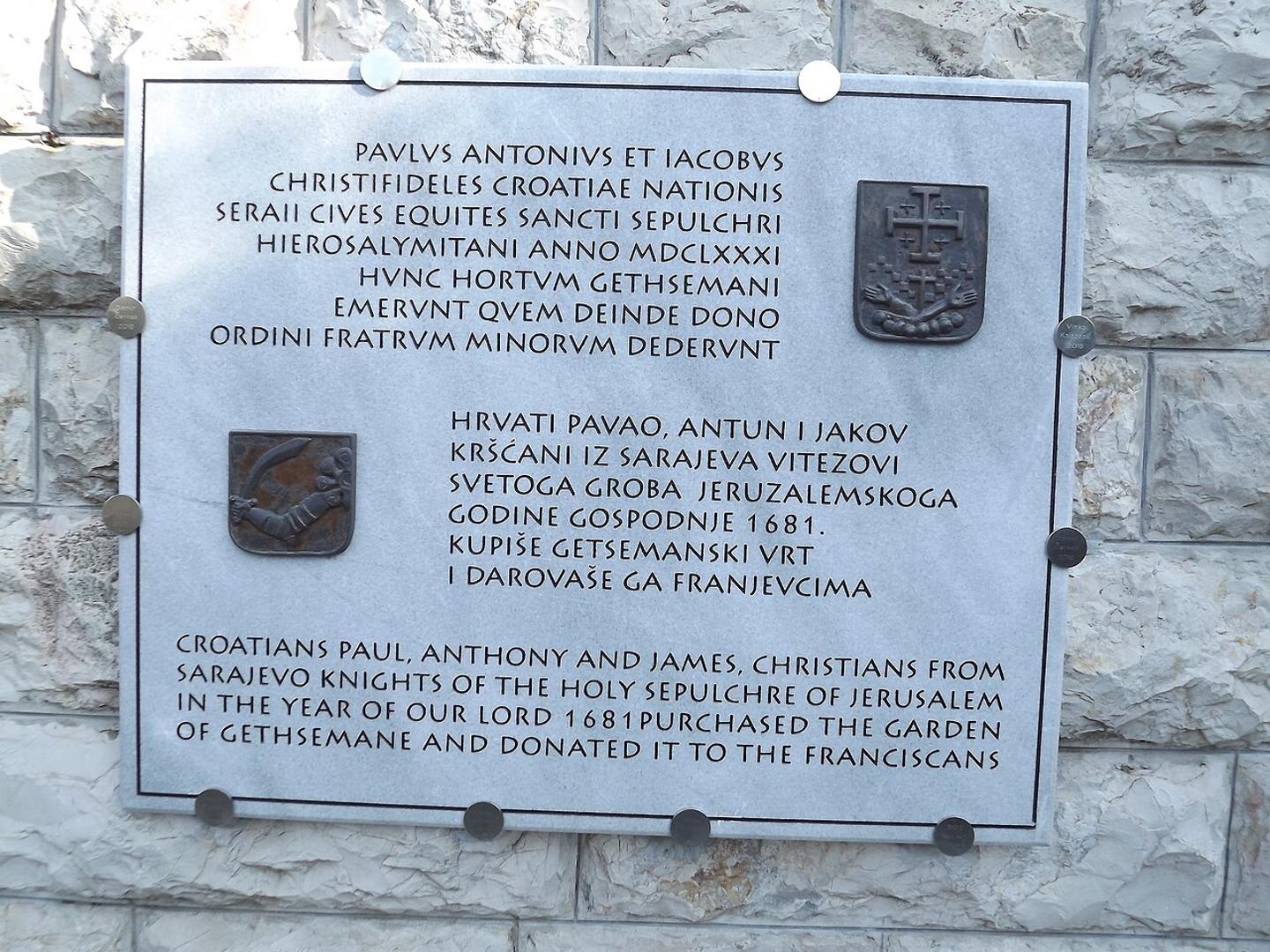 Iako u našoj zemlji mnogi to znaju, u svijetu je malo poznata činjenica da jedno od najsvetijih mjesta kršćanstva – Getsemanski vrt u Jeruzalemu – danas pripada Katoličkoj crkvi zahvaljujući trojici Hrvata iz Sarajeva. Godine 1681., braća Antun, Pavle i Jakov Branković, prodali su svu svoju imovinu u Bosni i Hercegovini kako bi od tadašnjih turskih vlasnika otkupili vrt u kojem je započela Kristova muka.
