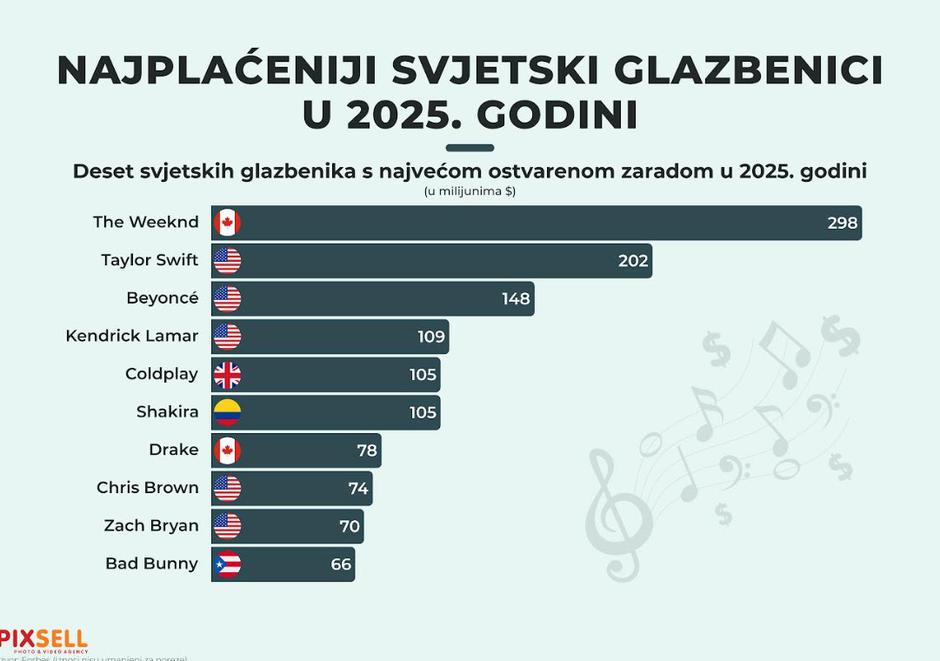 Deset najplaćenijih svjetskih glazbenika u 2025. godini predvodi The Weekend s 298 milijuna dolara zarade. Nastavljaju Taylor Swift (202 milijuna), Beyoncé (148 milijuna), Kendrick Lamar (105 milijuna), Drake (105 milijuna), Chris Brown (74 milijuna), Zach Bryan (70 milijuna) i Bad Bunny (66 milijuna dolara).