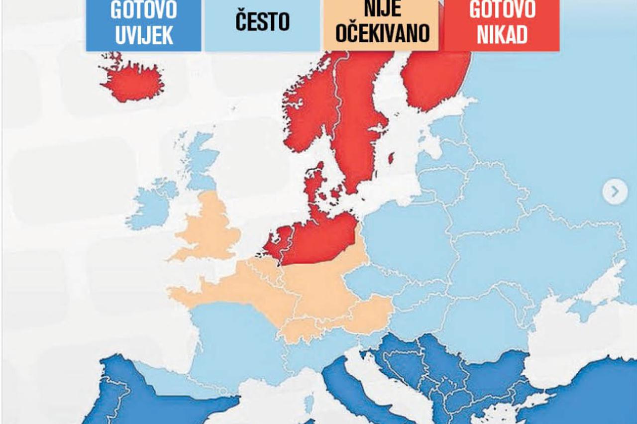 Naime, posljednjih dana na svim društvenim mrežama dijeli se jedna nadasve zanimljiva karta koja prikazuje vjerojatnost da kao gost budete ponuđeni hranom u pojedinim zemljama diljem Europe.