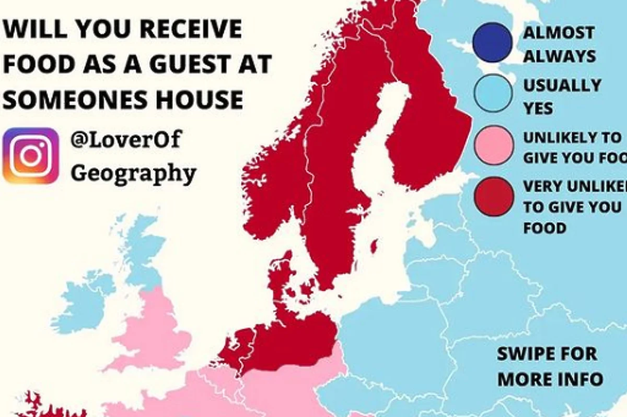 Karta prikazuje hoćete li kao gost u domaćinstvima europskih zemalja biti posluženi hranom, a zemlje su podijeljene u četiri kategorije: gotovo uvijek, vjerojatno da, vjerojatno ne, gotovo sigurno ne.