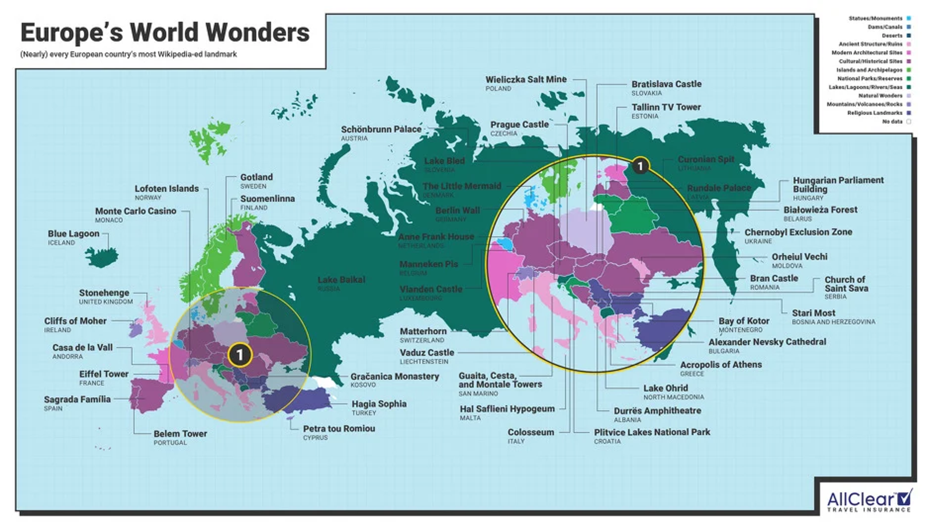 Osiguravajuća kompanija AllClear kreirala je kartu najpopularnijih znamenitosti zemalja svijeta, a svoje rezultate zasnovali su na broju pregleda stranica koje je svaki orijentir dobio na Wikipediji.