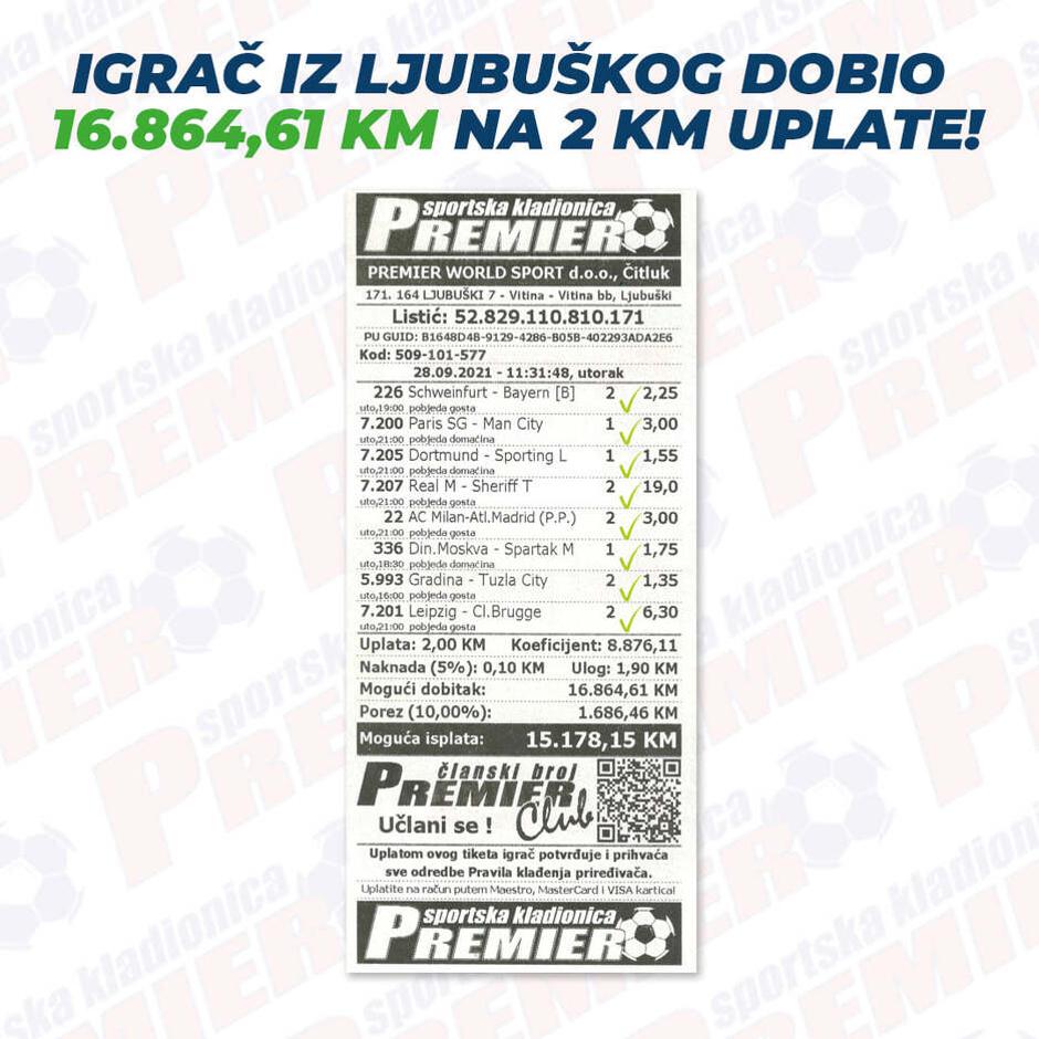 Inače, tiket koji je odigrao svakako zaslužuje pohvalu kod kladioničara budući da je 15.000 KM dobio na samo dvije uložene marke.