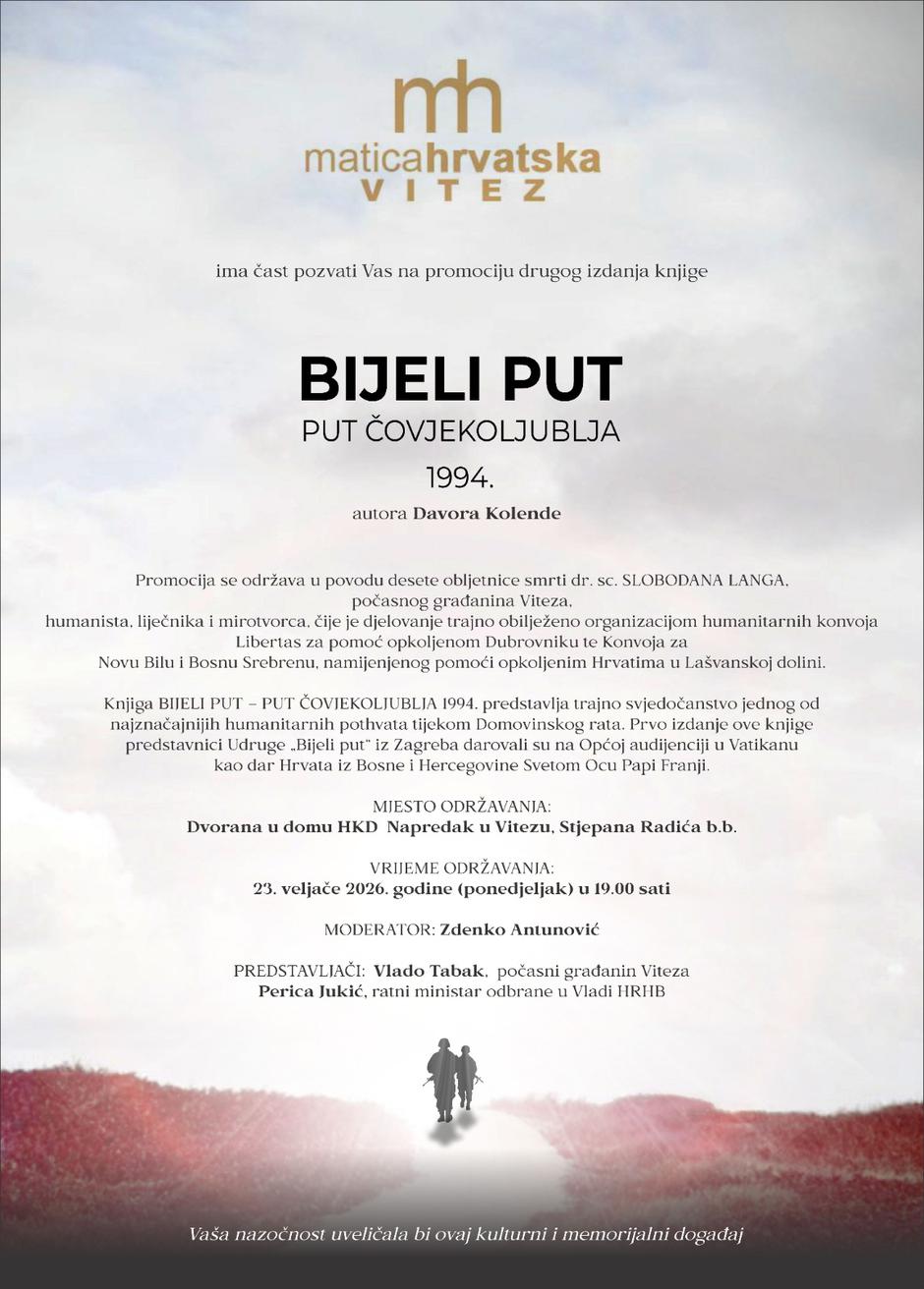 Sutra se obliježava 10. godisnjica smrti dr. Slobodana Langa, tim povodom će u Vitezu, gdje je proglašen počasnim građaninom, biti upriličena promocija drugog izdanja knjige "Bijeli put, put čovjekoljublja 1994." autora Davora Kolende. Knjiga je značajnim dijelom sadržaja posvećena humanom djelovanje dr. Langa na području BIH, napose središnje Bosne. Kroz zanimljive, često i šaljive događaje, opisuje zgode i nezgode u kojima su sudjelovali dr. Lang, autor i brojni drugi likovi.