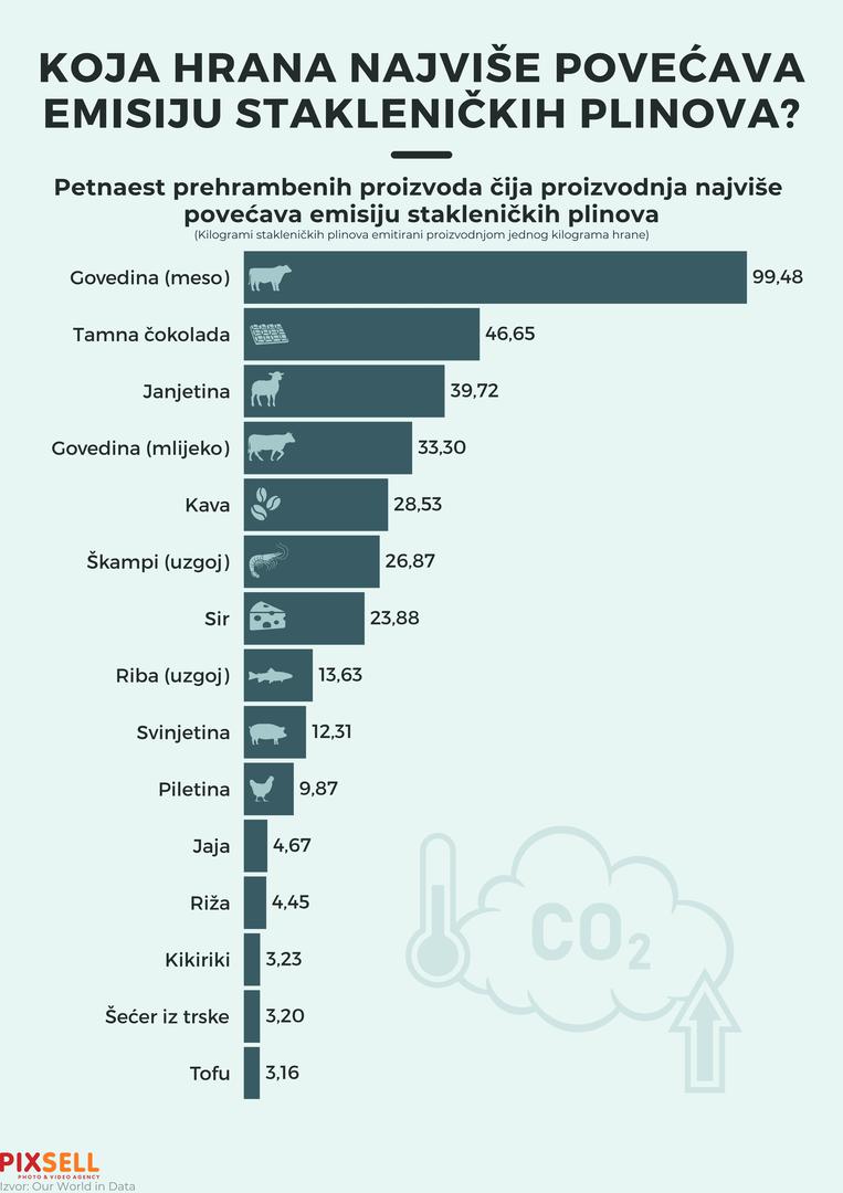 Novo istrazivanje pokazuje koje namirnice najviše doprinose emisiji stakleničkih plinova tijekom proizvodnje. Na vrhu liste nalazi se govedina, čija proizvodnja emitira čak 99,48 kilograma stakleničkih plinova po kilogramu mesa. Slijedi tamna čokolada s 46,65 kilograma te janjetina s 39,72 kilograma. Među namirnicama s visokim emisijama nalaze se i mlijeko od goveda (33,30), kava (28,53) i uzgojeni skampi (26,87). S druge strane, biljni proizvodi poput tofua, šećera od trske i kikirikija imaju znatno manji ugljični otisak, ispod 3,5 kilograma CO₂ po kilogramu.