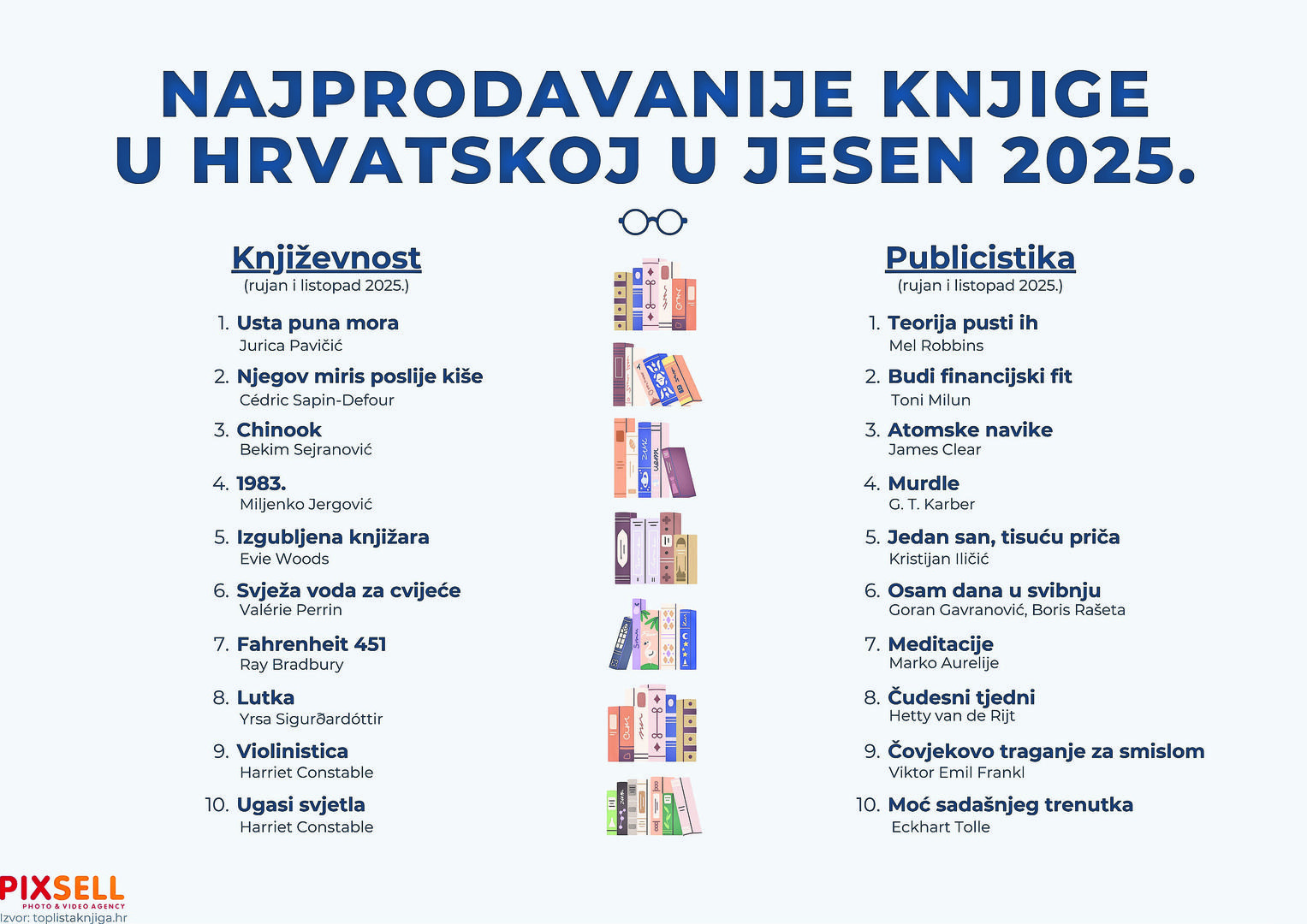 Najprodavanije knjige književnosti su "Usta puna mora" Jurice Pavičića, "Njegov miris poslije kiše" Cedrica Sapina Defoura i "Chinook" "Bekima Serjanovića. Najprodavanije knjige publicistike su "Teorija pusti ih" Mela Robbinsa, "Budi financijski fit" Tonija Miluna i "Atomske navike" Jamesa Cleara.