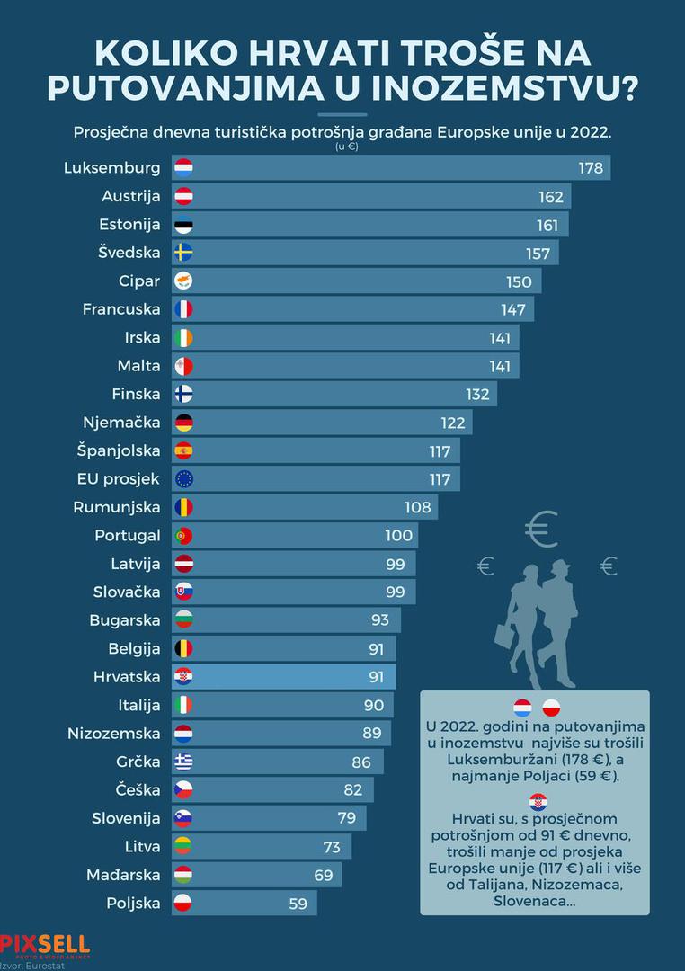 Infografika, koju je objavio Pixsell, prikazuje prosječnu dnevnu turističku potrošnju građana Europske unije u 2022. godini