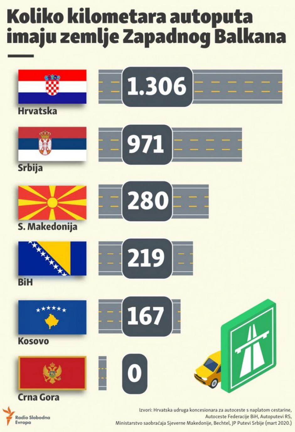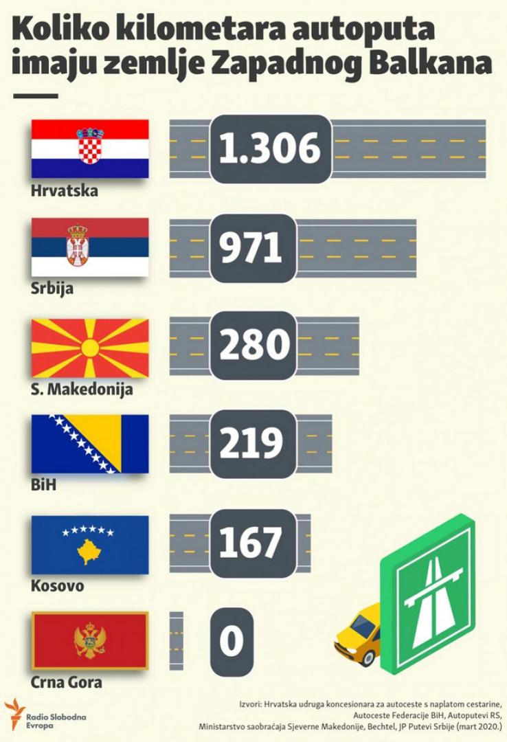Prema podacima Autocesta FBiH, Autoputeva RS, Hrvatske udruge koncesionara za autoceste s naplatom carine, Ministarstva prometa Sjeverne Makedonije, Bechtela i JP Putevi Srbije, od svih zemalja u regiji najviše kilometara autoputa ima, očekivano, Hrvatska – 1.306, piše radio slobodna Europa (RSE).