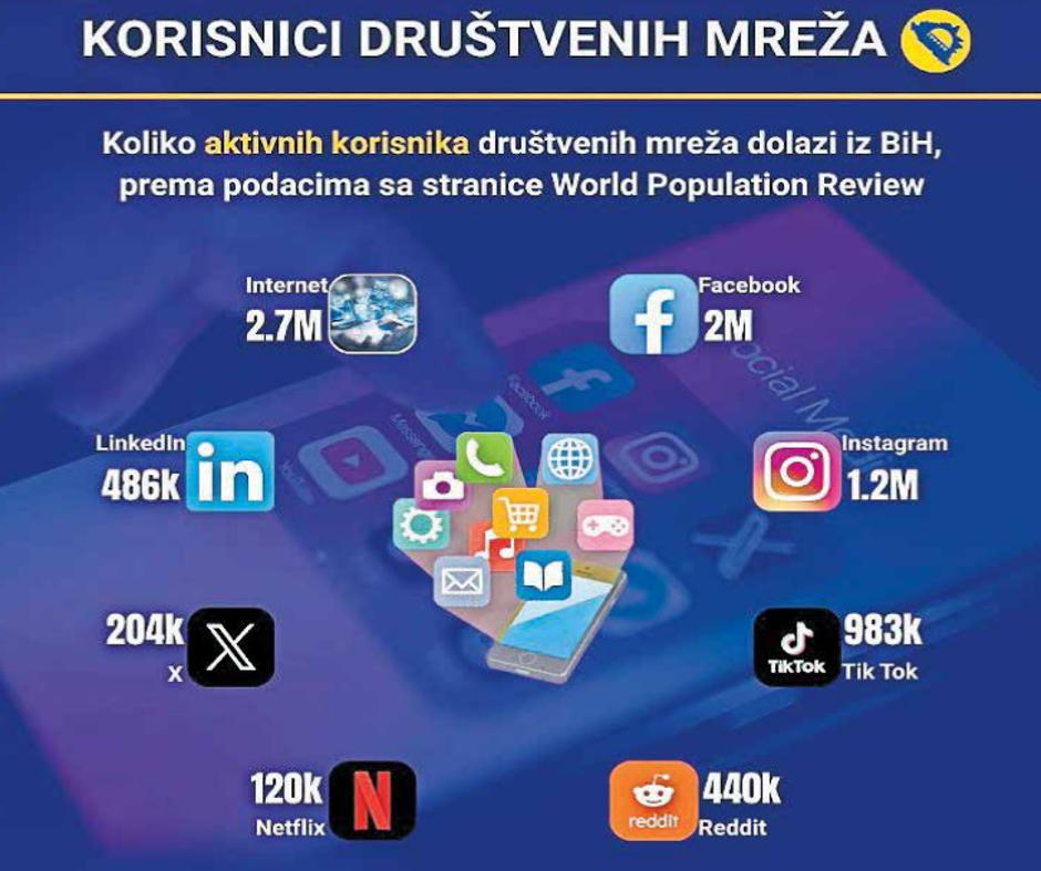Gotovo 80 posto odraslog stanovništva u Bosni i Hercegovini koristi društvene mreže, što pokazuje da su one duboko integrirane u digitalni život građana.