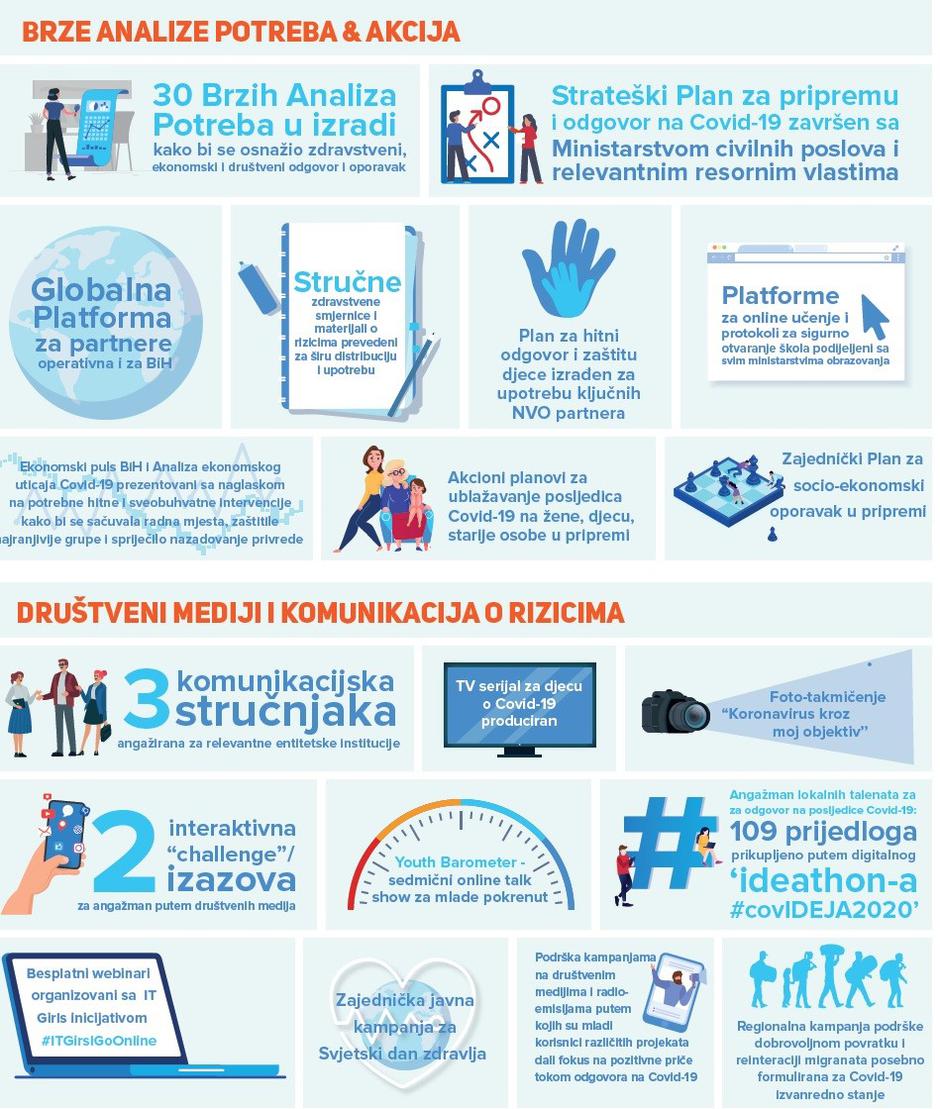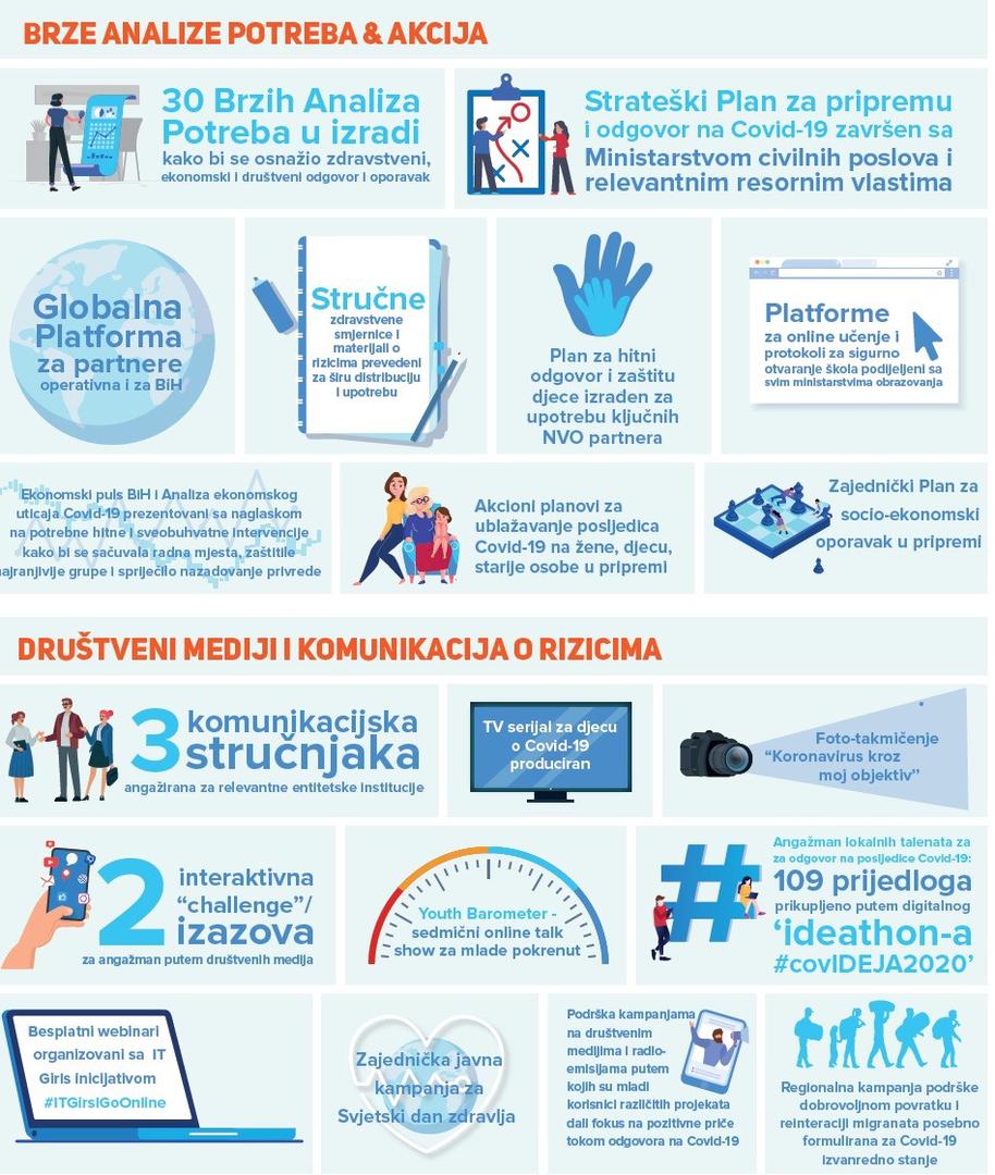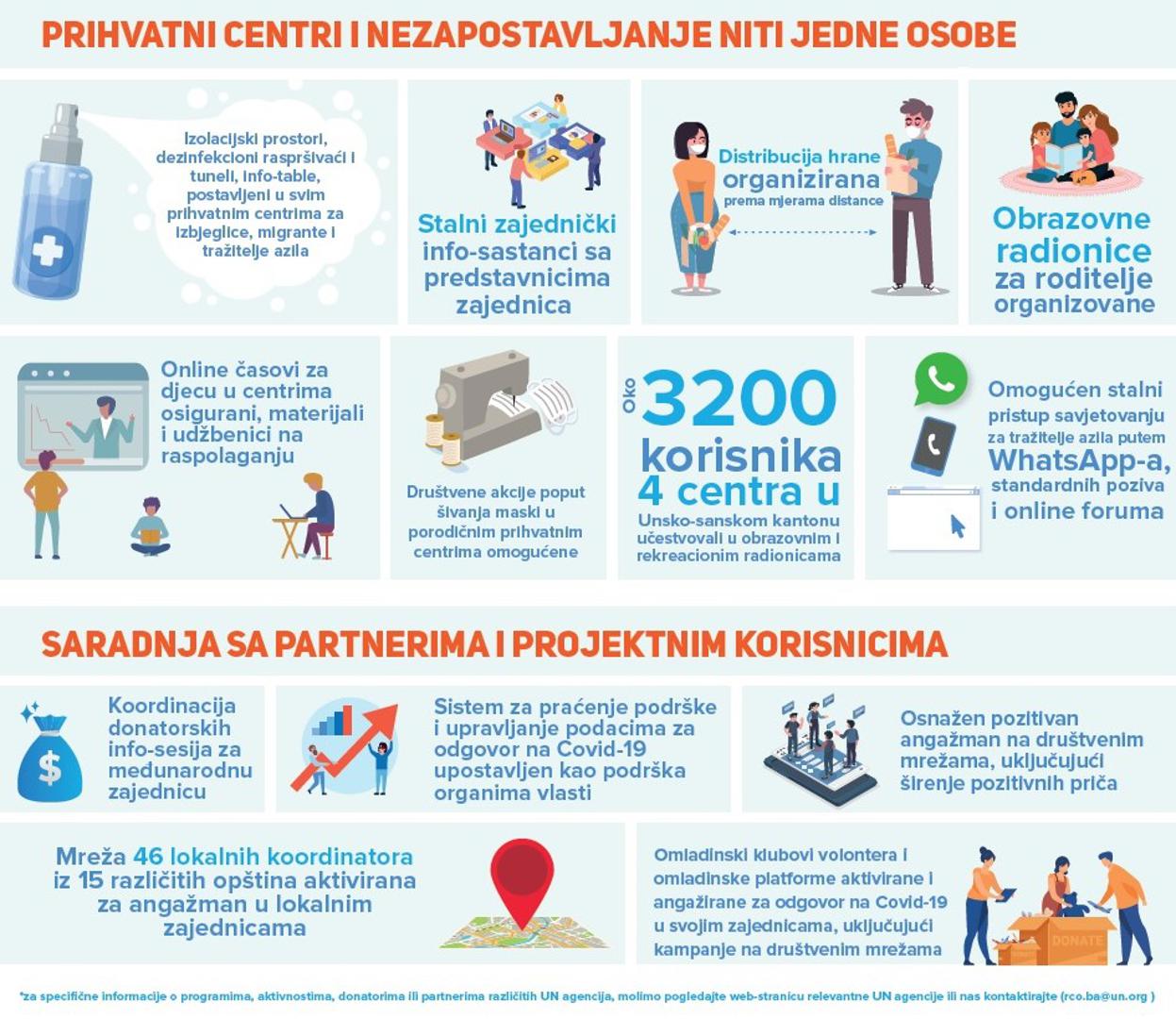 Tim Ujedinjenih naroda u Bosni i Hercegovini predstavlja vizualni prikaz ključnih aktivnosti poduzetih tijekom prvog odgovora na Covid-19 pandemiju, s velikom zahvalnošću svim partnerima u BiH koji su omogućili brzu podršku kroz stručne agencije UN-a na terenu. Aktivnosti su provedene u razdoblju ožujak –svibanj 2020.