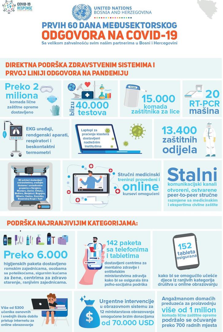 Na samom početku krize, Ujedinjeni narodi u BiH su se odmah angažirale na različitim razinama kako bi se omogućili koordinirani napori podrške vlastima u BiH u borbi protiv pandemije, pomoći zdravstvenim sustavima, ekonomiji, obrazovanju, i naporima da se nitko ne zapostavi niti zaboravi u ovim izazovnim vremenima.