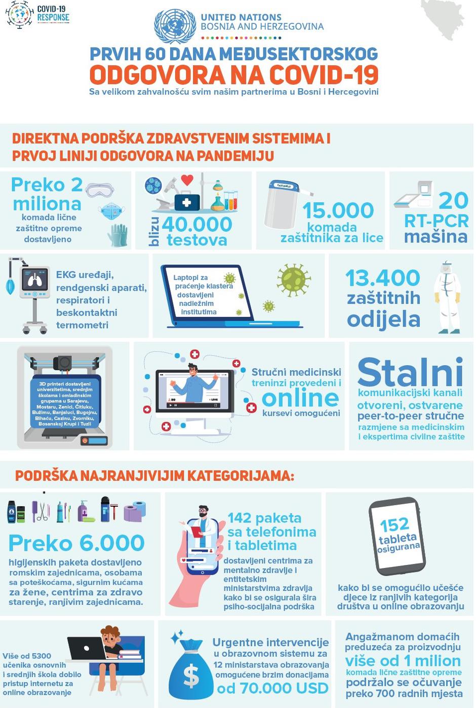 Početni mjeseci odgovora na pandemiju su, na ovaj ili onaj način, utjecali na svakoga od nas, što je zahtjevalo brzu i ciljanu akciju. Tijekom prvih 60 dana odgovora na Covid-19 (ožujak – svibanj), Ujedinjeni narodi u BiH su se fokusirale na: