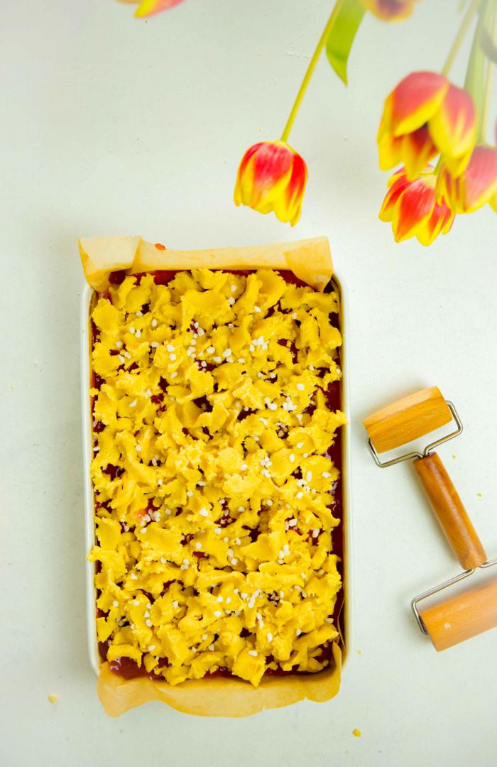 Namažite, zatim, džem od jagode, a onda gore prstima iskidajte ostatak tijesta kako biste dobili „čupavi“ efekt.