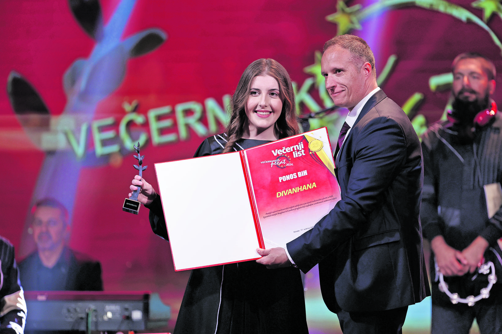 - U djetinjstvu nisam živio u izobilju, znam kako je kada je potrebna pomoć, a nema je nigdje, zato danas stojim ovdje ne zbog sebe već zbog svih onih čije su nesreće postale i moje, čije smo nesreće pretvorili u trijumfe zajedničkim snagama - poručio je, među ostalim, uspješni gospodarstvenik i veliki humanitarac. Posebno priznanje “Ponos BiH” pripalo je i bendu Divanhana, koji visoko pozicionira BiH na glazbenoj karti svijeta. Večernjakovu skulpturu uručio im je glavni urednik Federalne novinske agencije Dejan Jazvić.