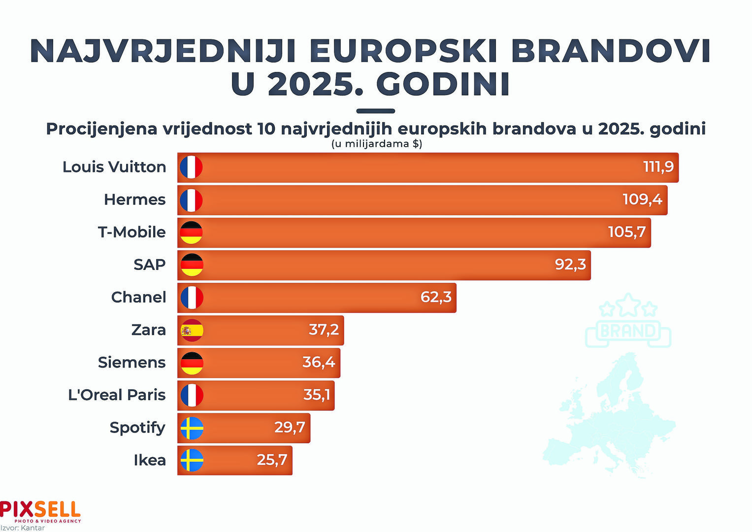 Prema podacima istraživačke kuće Kantar, na samom vrhu ljestvice najvrjednijih europskih brendova u 2025. nalazi se Louis Vuitton, s impresivnih 111,9 milijardi dolara. Odmah iza Louis Vuittona je Hermes s vrijednošću od 109,4 milijarde dolara, dok se Chanel nalazi na petom mjestu sa 62,3 milijarde dolara. Francuska tako zauzima tri od pet vodećih pozicija. T-Mobile sa 105,7 milijardi dolara i SAP s 92,3 milijarde dolara zauzimaju treće i četvrto mjesto. Španjolska je na listi zahvaljujući Zari, koja vrijedi 37,2 milijarde dolara, dok Švedska doprinosi s dva globalno prepoznatljiva brenda - Spotify (29,7 milijardi dolara) i Ikea (25,7 milijardi dolara).