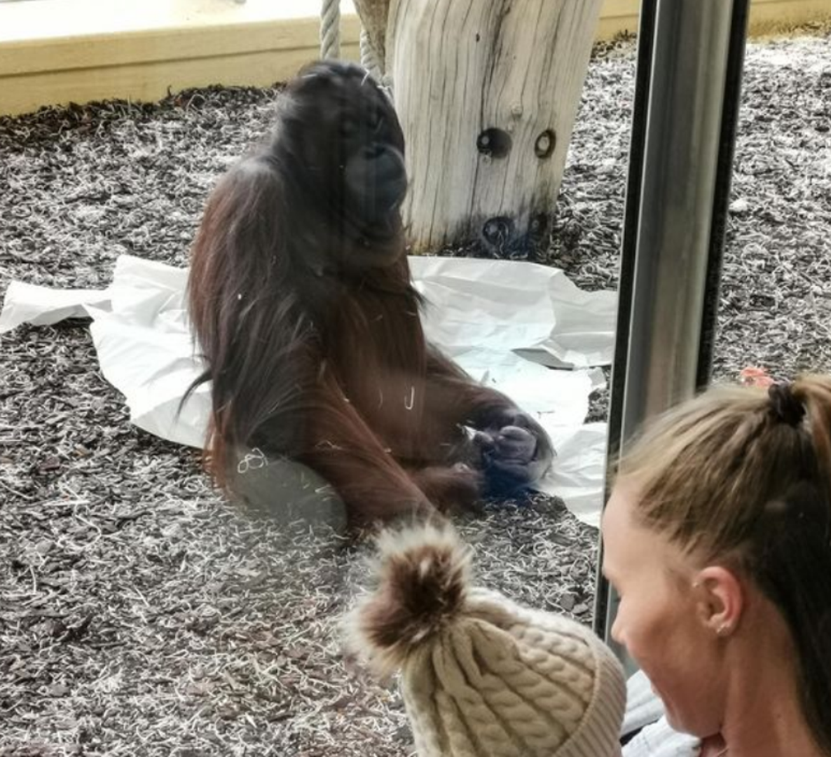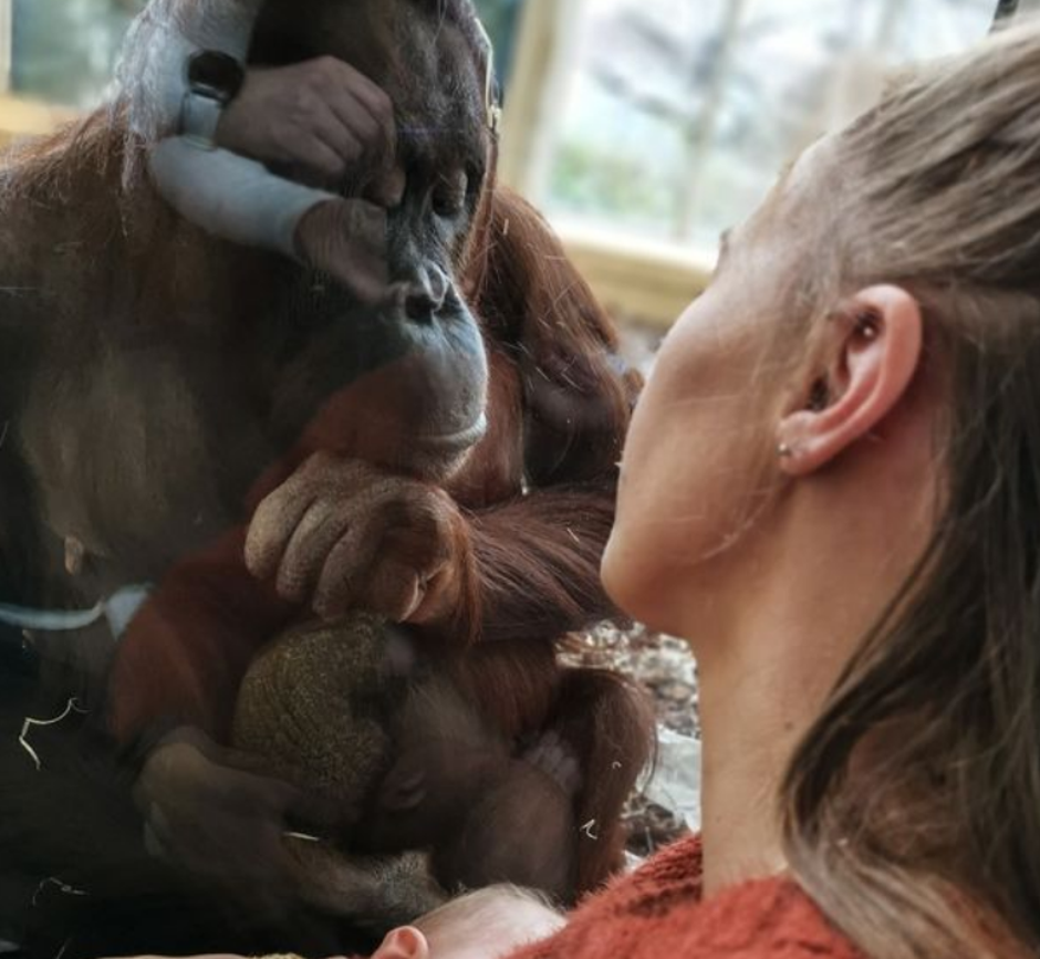 Gemma Copeland (30) bila je u zoološkom vrtu u Beču sa svojim dvo i pol mjesečnim sinom Jasperom i partnerom Shaneom (31). Jasper je ogladnio i trebala ga je dojiti, a taman je bila kraj nastambe orangutana. Sjela je na pod kraj stakla, a orangutanica je mirno gledala kako Gemma doji Jaspera, piše Mirror.