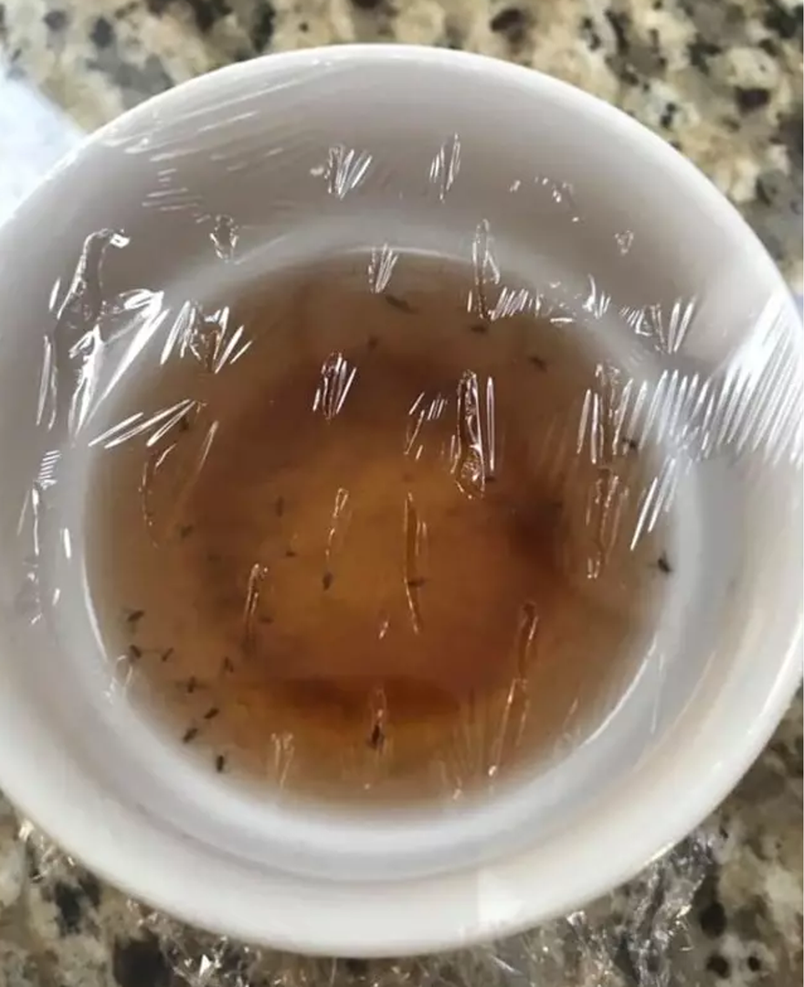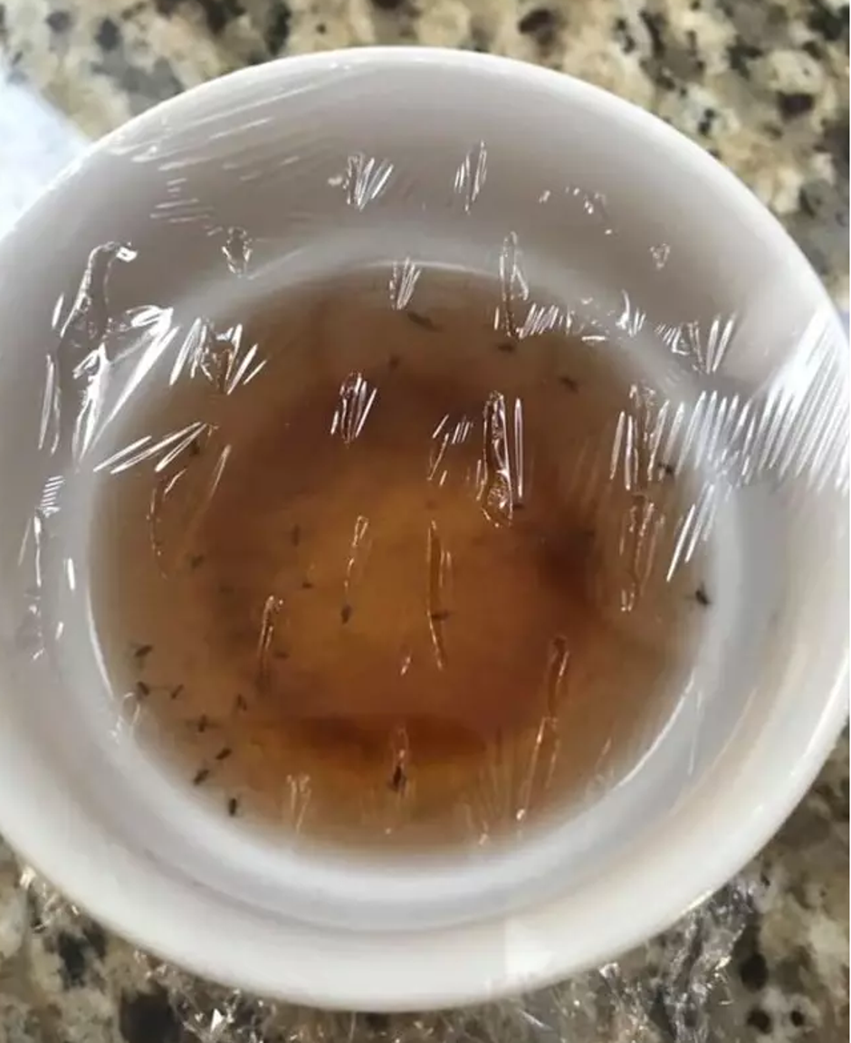 Jednostavno je u nekoliko šalica stavila jabučni ocat, prekrila ih prozirnom folijom i čačkalicama napravila rupice. Mušice privlači slatkasti miris i uđu u šalicu na ocat, a onda ne mogu pobjeći.