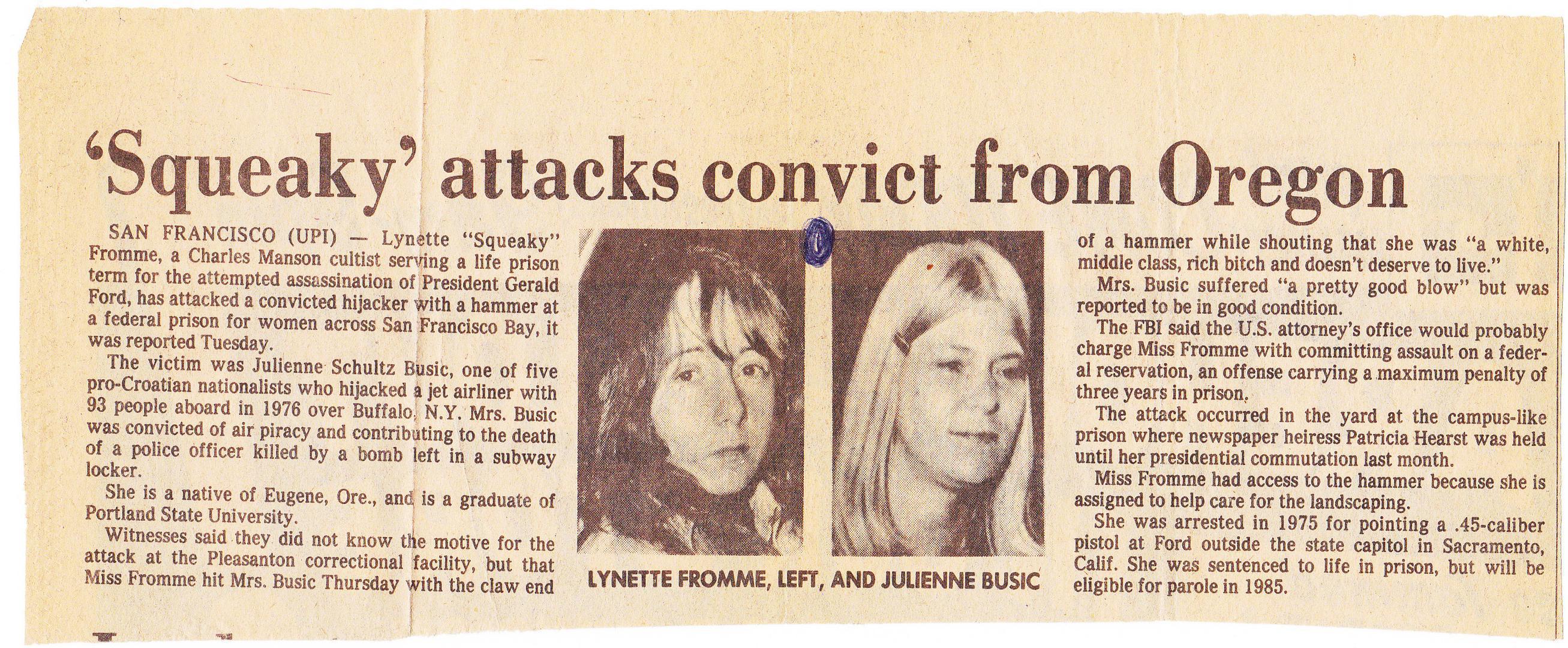 U njezinu umu, predsjednik Ford bio je glavni krivac. Na kraju je osuđena na doživotni zatvor i kaznu je trebala odslužiti u federalnom zatvoru u Pleasantonu, Kalifornija. Ja sam tad već tri godine bila u tom zatvoru zbog svoje uloge u otmici zrakoplova. „Squeaky“ mi se trebala pridružiti.