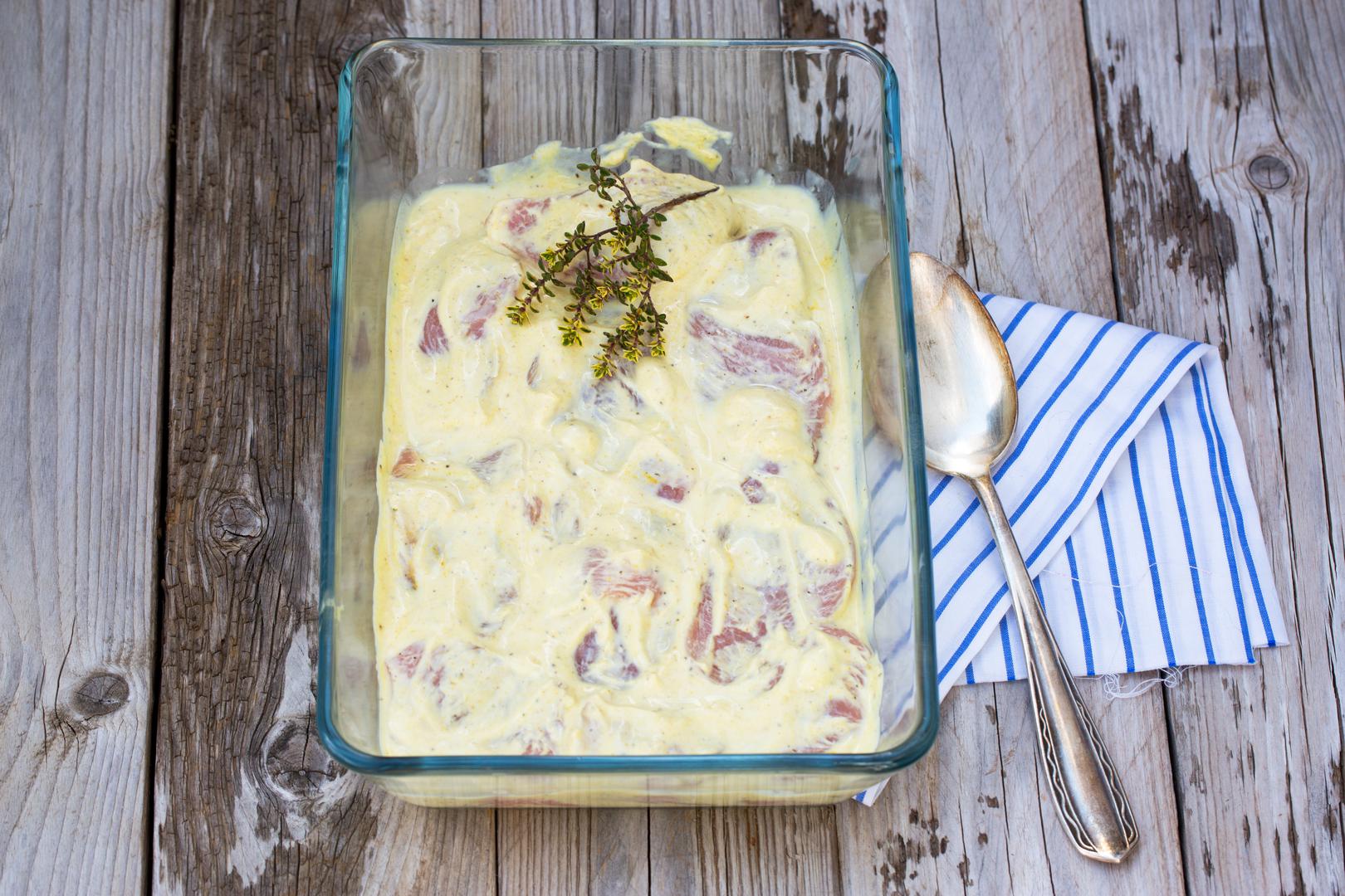 Marinada s jogurtom: Sastojci: 200 ml jogurta, 2 žlice suncokretovog ulja, korica i sok jedne naranče, manji luk i 2 češnja češnjaka, korijandar i 1⁄2 žličice cimeta, žličica svježe naribanog đumbira, 1⁄2 žličice soli, mljeveni papar. Priprema: U mužaru usitnite suhe sastojke uz dodatak ulja, pa sve pomiješajte s jogurtom te sokom i koricom naranče.