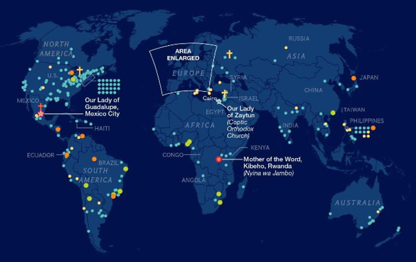 Karta koju je izradio National geographic pokazuje gdje se nalaze marijanska svetišta, u Europi su posebno omiljene destinacije Italija i Francuska, te južna Njemačka i Belgija. U tradicionalnim utvrdama kršćanstva Španjolskoj i Poljskoj marijanskih svetišta je relativno malo. Ima ih u zapadnoj Ukrajini, nešto u Mađarskoj, gotovo nijedno na Balkanu, osim Međugorja, prenosi Express.hr