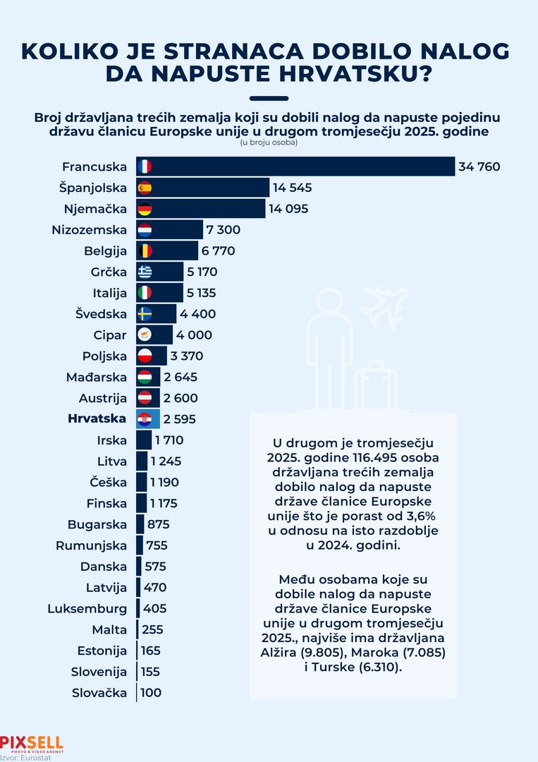 U drugom je tromjesečju 2025. godine 116.495 državljana trećih zemalja dobilo nalog da napusti države članice Europske unije, što je porast od 3,6% u odnosu na isto razdoblje u 2024. godini. Među osobama koje su dobile nalog da napuste države članice Europske unije u drugom tromjesečju 2025. najviše je državljana Alžira (9805), Maroka (7085) i Turske (6310).