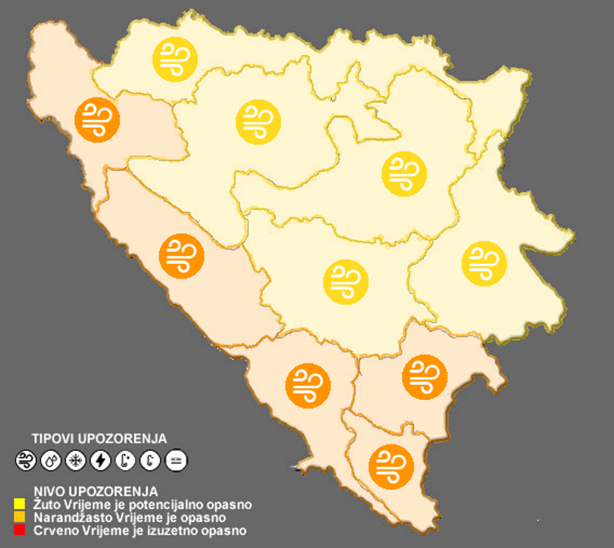 Inače, u cijeloj je BiH danas upaljen meteoalarm, i to za pet regija narančasti, a za pet žuti.