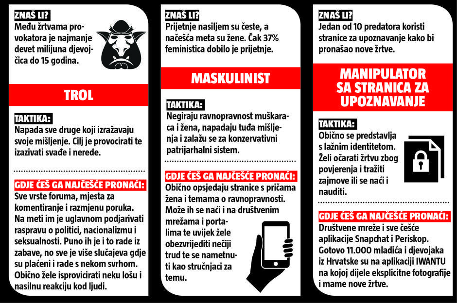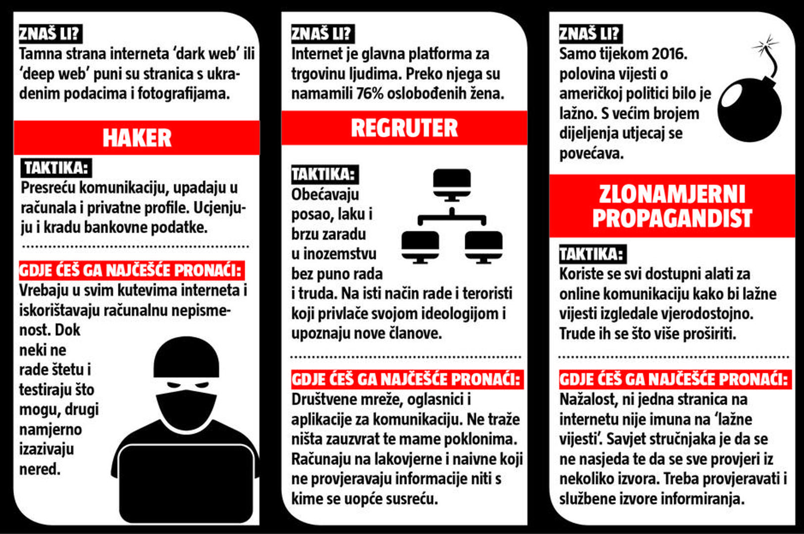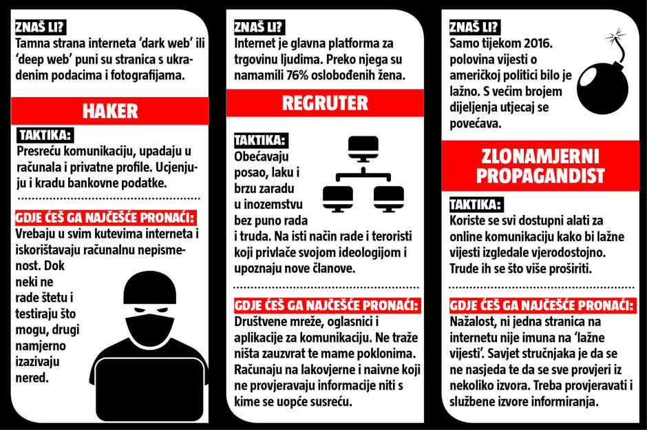- Moj kolega slučajno je otkrio tajne Facebook grupe koje traže vrijeme da vas odobre. Žele vas provjeriti, a ako prođete, dobijete upute kako pristupiti još jednoj tajnoj grupi. U njoj vam nude za 100 dolara pedofilsko iskustvo te čak i večere. Zasad je to ograničeno na SAD, no blizu je primjera maloljetnica koje su nudile seks i oralno zadovoljavanje ako im date bon za mobitel i slično - kaže stručnjak. Osim toga, sve se više šire grupe koje preko interneta šire lažne vijesti. Uz dobru naknadu, spremi su podvaliti što god želite. Stručnjak kaže kako im je u tim slučajevima najlakše platiti oglase, čiju istinitost uglavnom ne provjeravaju. Prevarantima u korist idu i loše navike ljudi koji ne čitaju i prihvaćaju sve “zdravo za gotovo”.