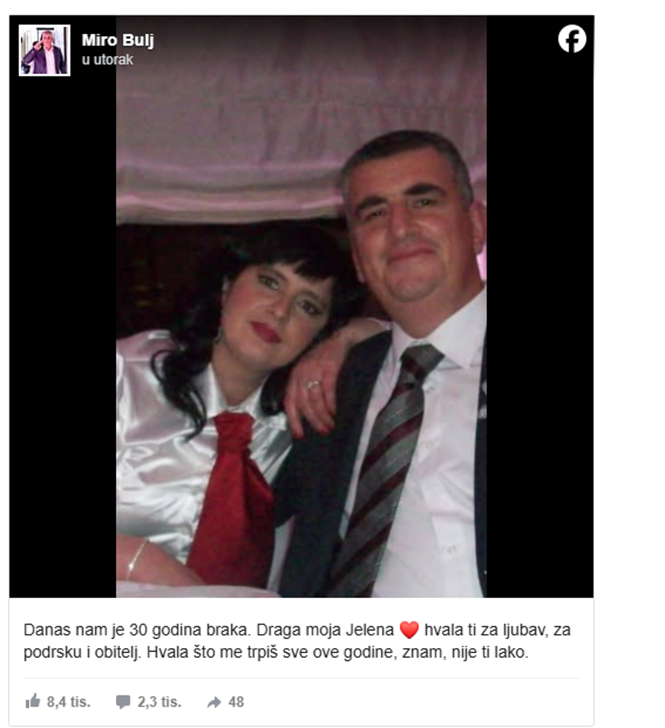 - Danas nam je 30 godina braka. Draga moja Jelena ❤️ hvala ti za ljubav, za podršku i obitelj. Hvala što me trpiš sve ove godine, znam, nije ti lako - napisao je Bulj.