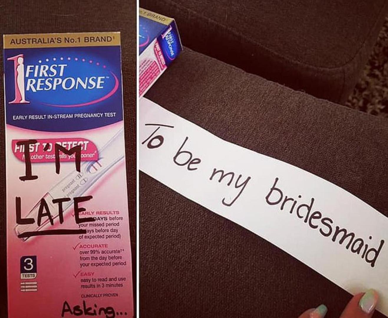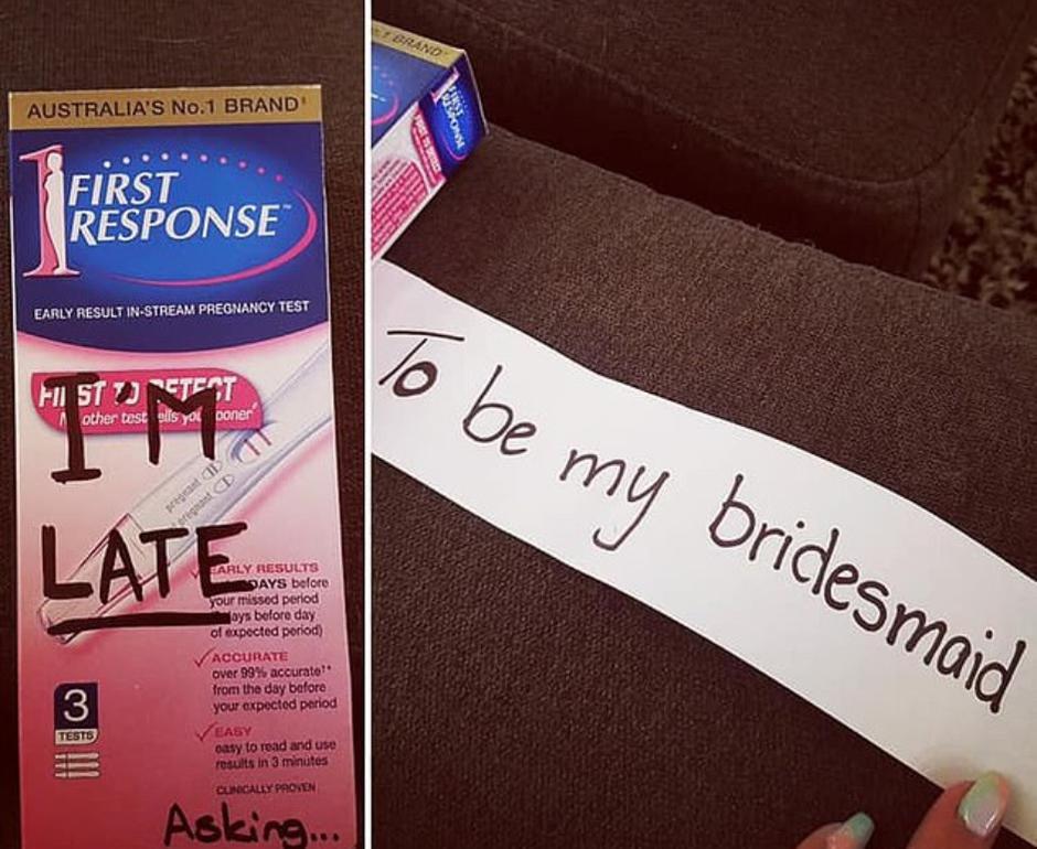 Ona je na kutiju testa za trudnoću napisala 'Kasni mi' i 'Pitam te...', a u kutiju je spremila papirić s natpisom 'da mi budeš djeveruša'.