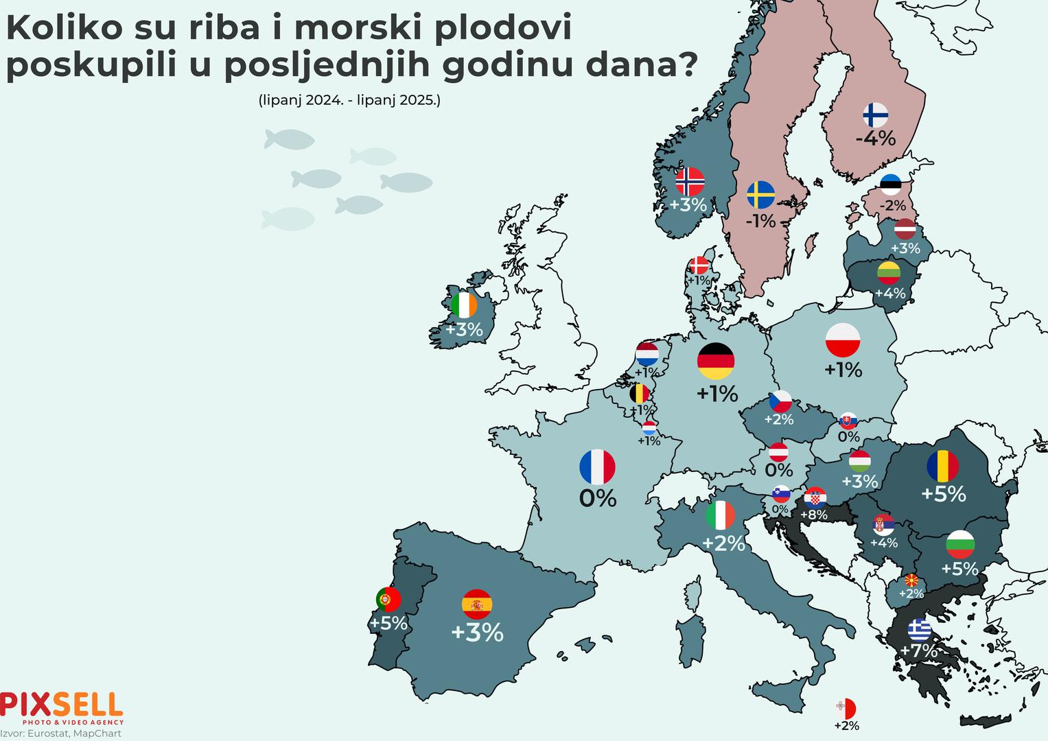 Infografika prikazuje koliko su riba i morski plodovi poskupjeli u europskim zemljama u razdoblju od lipnja 2024. do lipnja 2025., pri čemu najveći rast cijena bilježe Grčka, Portugal, Rumunjska i Sjeverna Makedonija (od +5% do +7%). U Hrvatskoj su cijene ribe i morskih plodova porasle za 4%, dok su u nekim zemljama, poput Finske i Švedske, čak zabilježena i pojeftinjenja.