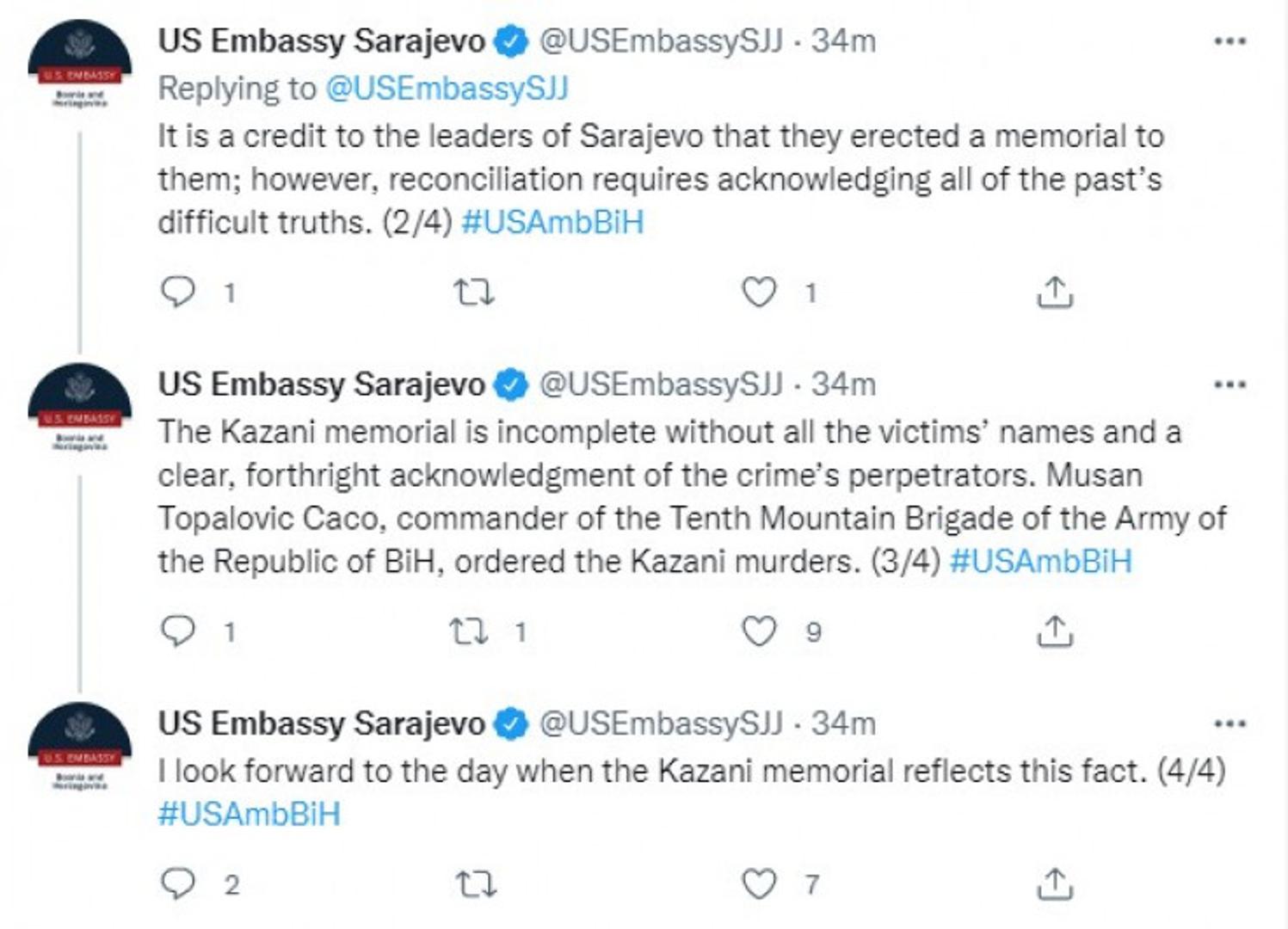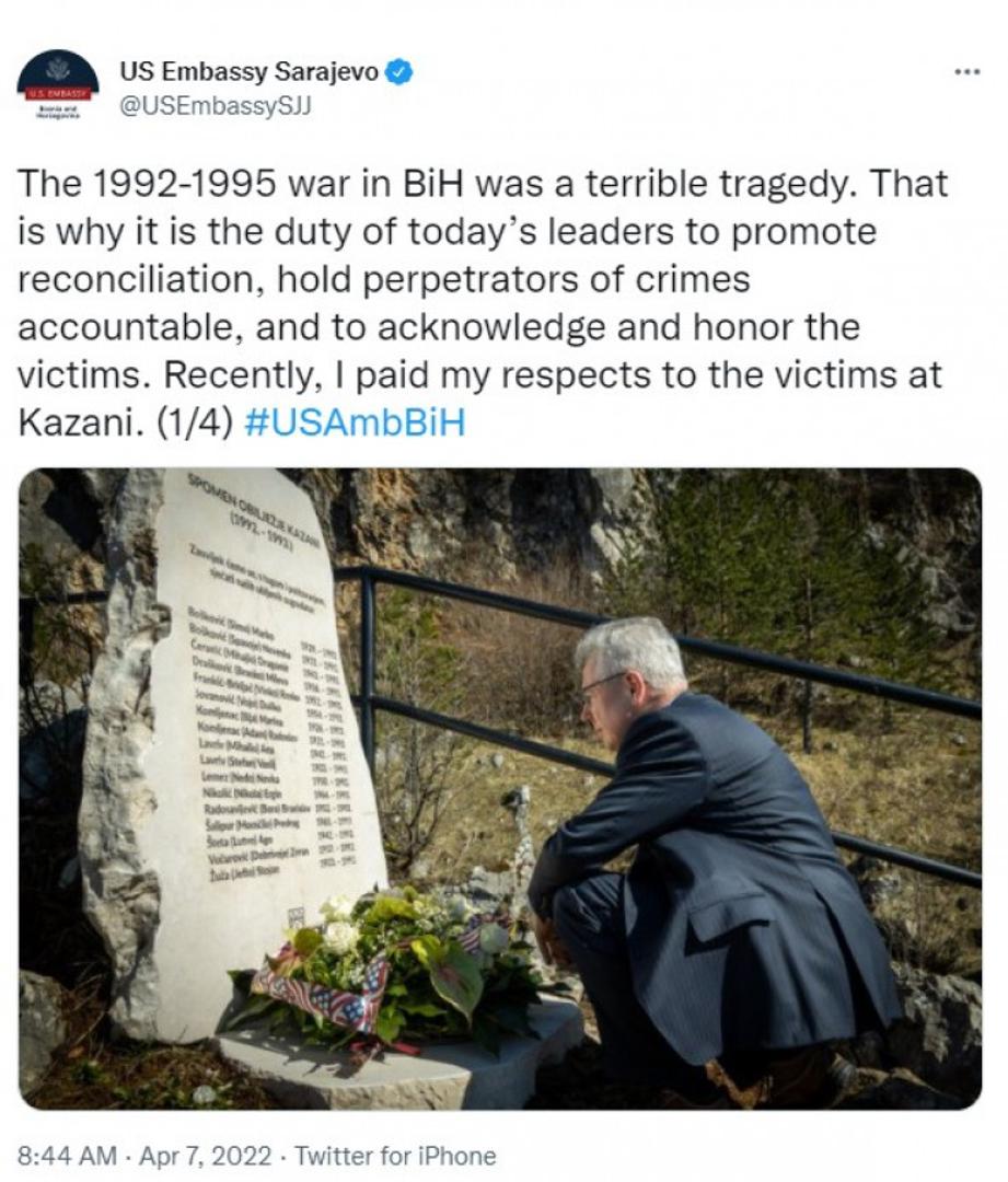 - Rat u BiH 1992-1995 bio je užasna tragedija. Zato je dužnost današnjih lidera promicati pomirenje, pozivati počinitelje zločina na odgovornost, te odati priznanje i odati počast žrtvama. Nedavno sam odao počast žrtvama na Kazanima - napisao je Murphy na Twitteru.