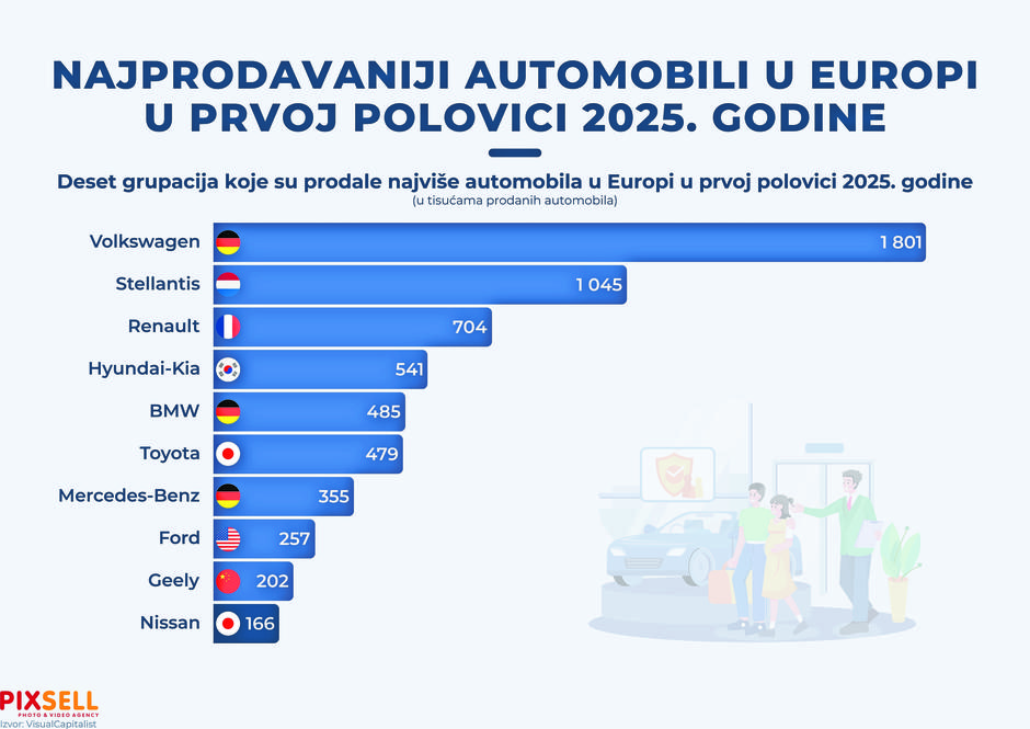 Među proizvođačima na prvom je mjestu Volkswagen grupa, koja je prodala 1,8 milijuna vozila. Njemački div tako je zadržao značajnu prednost ispred konkurencije. Na drugom mjestu našla se grupacija Stellantis s prodanih 1,045 milijuna automobila, dok je treći Renault sa 704 tisuće vozila. Među prvih pet još su Hyundai - Kia s 541 tisućom te BMW s 485 tisuća prodanih automobila.