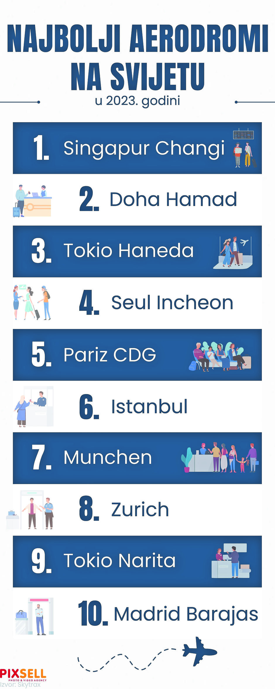 Na prvom mjestu nalazi se zračna luka Singapur Changi, poznata po vrhunskoj usluzi i impresivnim sadržajima. Slijede Doha Hamad u Kataru i Tokio Haneda u Japanu. Četvrto i peto mjesto zauzimaju Seoul Incheon i Tokyo Narita, dok se na šestom mjestu nalazi zračna luka u Hong Kongu. U europskom vrhu su Paris Charles de Gaulle (7. mjesto), Rome Fiumicino (8. mjesto), München (9. mjesto) i Zürich (10. mjesto). Ova lista ističe izvrsnost azijskih i europskih zračnih luka u pružanju udobnosti, učinkovitosti i korisničkog iskustva.