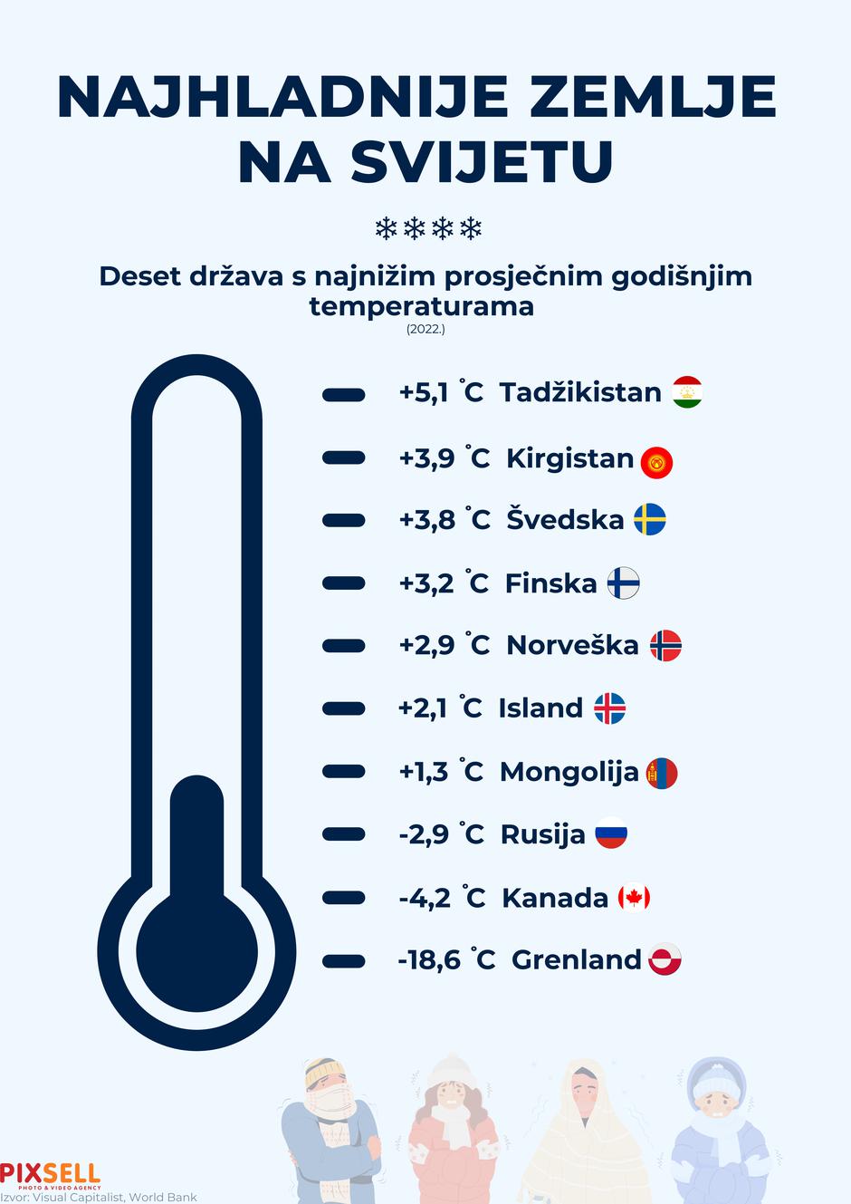 Prema podacima iz 2022. godine, Grenland je najhladnija zemlja na svijetu s prosječnom godišnjom temperaturom od -18,6 °C. Slijede Kanada (-4,2 °C) i Rusija (-2,9 °C). Među deset najhladnijih zemalja nalaze se i Mongolija (+1,3 °C), Island (+2,1 °C) te skandinavske države Norveška (+2,9 °C), Finska (+3,2 °C) i Švedska (+3,8 °C). Tadžikistan (+5,1 °C) i Kirgistan (+3,9 °C) također su na listi zbog visokih nadmorskih visina.