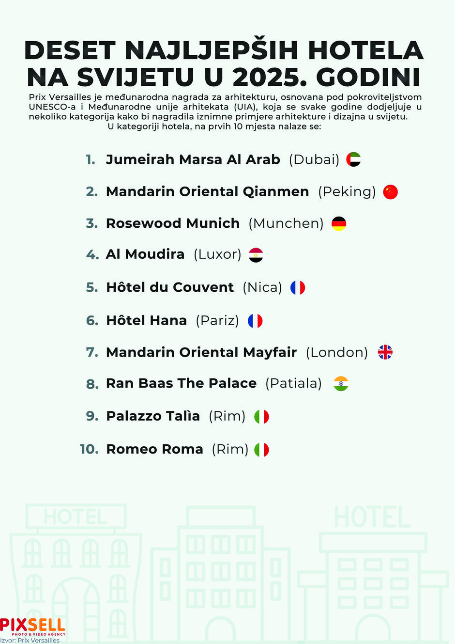 Na samom vrhu ljestvice nalazi se Jumeirah Marsa Al Arab iz Dubaija, koji svojim futurističkim izgledom i spektakularnom lokacijom na obali Perzijskog zaljeva ostavlja bez daha. Na drugo mjesto smjestio se Mandarin Oriental Qianmen iz Pekinga, savršen spoj tradicionalne kineske arhitekture i moderne udobnosti. Treće mjesto pripalo je Rosewood Munichu, elegantnom hotelu smještenom u povijesnom središtu Münchena, dok se na četvrtom mjestu našao egipatski hotel Al Moudira u Luxoru.