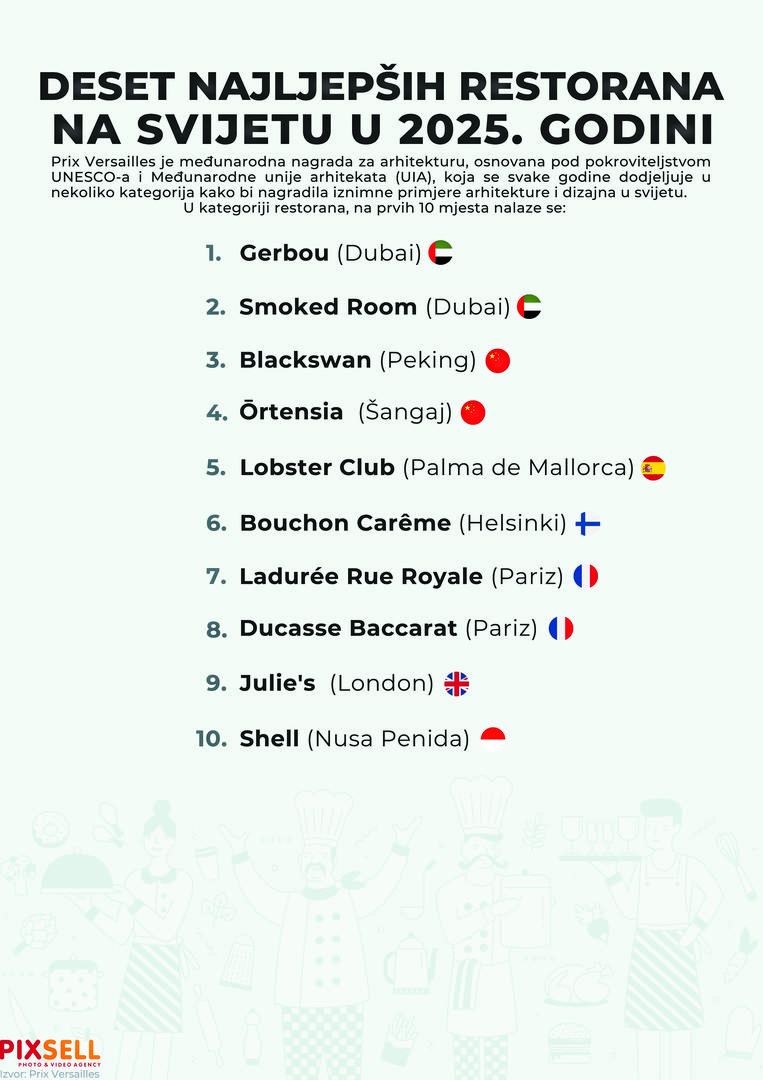 U najnovijem izboru Prix Versailles za 2025. godinu međunarodna nagrada za arhitekturu i dizajn pod pokroviteljstvom UNESCO-a i Međunarodne unije arhitekata (UIA), objavljena je lista deset najljepših restorana na svijetu.