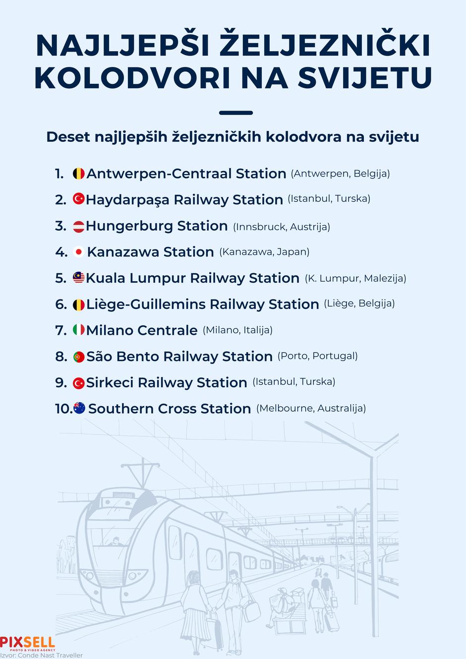 Prema izboru Condé Nast Travellera, među najljepšima na svijetu našli su se kolodvori koji spajaju povijest, moderan dizajn i impresivnu estetiku. Posebno su se istaknuli Antwerpen-Centraal Station u Belgiji, često nazivan i "željezničkom katedralom", te Haydarpaşa Railway Station u Istanbulu, simbol osmanske arhitekture s pogledom na Bospor. Austrijski Hungerburg Station u Innsbrucku oduševljava futurističkim linijama, dok Kanazawa Station u Japanu spaja tradicionalne elemente s modernom staklenom kupolom.