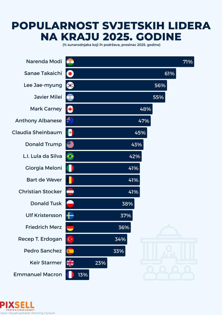 Infografika prikazuje rejting popularnosti svjetskih političkih lidera na kraju 2025. godine, mjeren postotkom sunarodnjaka koji ih podržavaju.