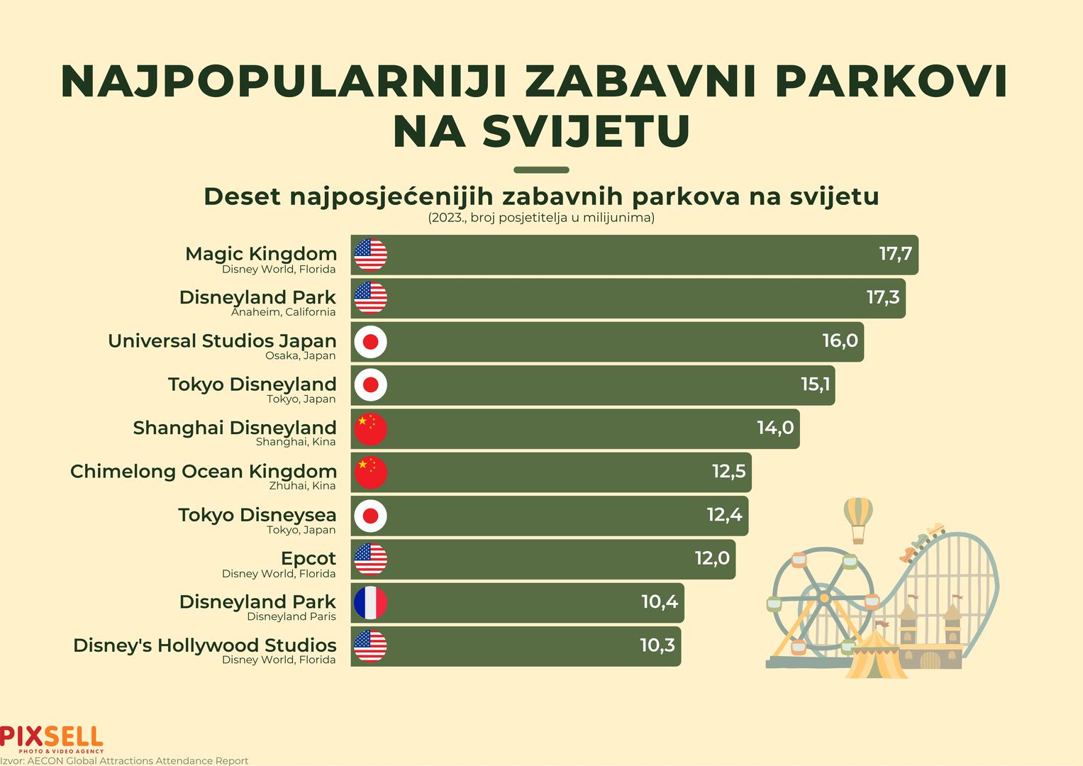 Prema istraživanju AECON-a, najpopularniji zabavni park na svijetu je Magic Kingdom (Disney) na Floridi sa 17,7 milijuna posjetitelja u 2023. godini, dok ga slijede Disneyland Park u Kaliforniji sa 17,3 milijuna te Universal Studios Japan u Osaki sa 16 milijuna.