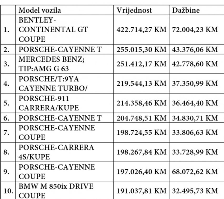 "Drugi najskuplji uvezeni automobil je Porsche-Cayenne T, koji je plaćen 255.015,30 KM, plus dažbine 43.376,06 KM. Treći skupocjeni automobil koji je uvezen je Mercedes-Benz tip AMG G 63, koji je iznosio 251.412,17 KM, plus dažbine 42.778,60 KM", podatak je UNO BiH.