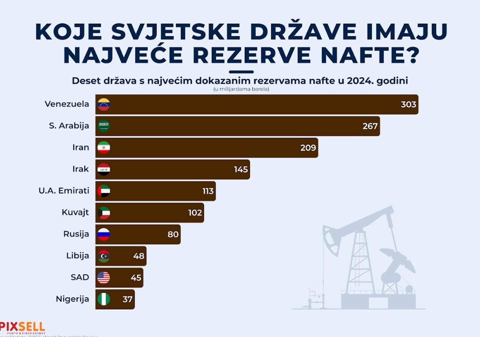 Najveće rezerve nafte na svijetu imaju Venezuela (303), Saudijska Arabija (267) i Iran (209)