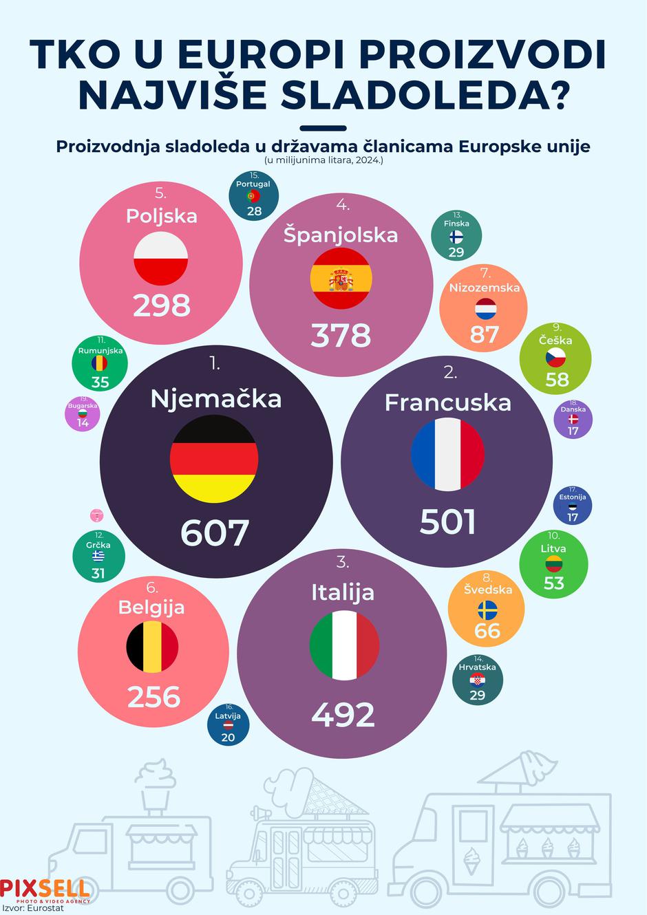 Tako je najveći proizvođač Njemačka, a slijede je Francuska i Italija. Hrvatska se, prema ovim pokazateljima, nalazi na 14. mjestu s proizvedenih 29 milijuna litara sladoleda.